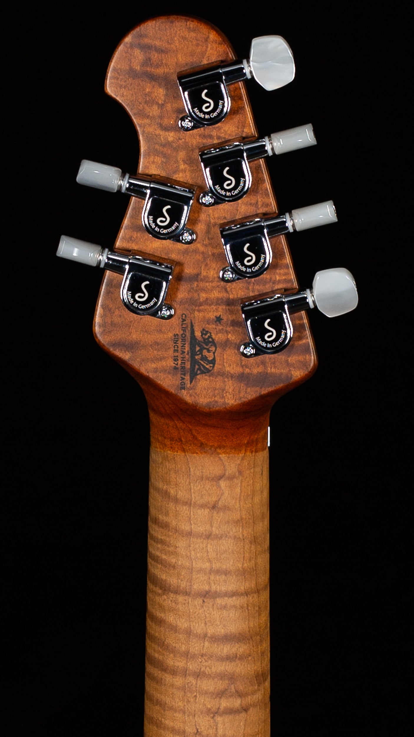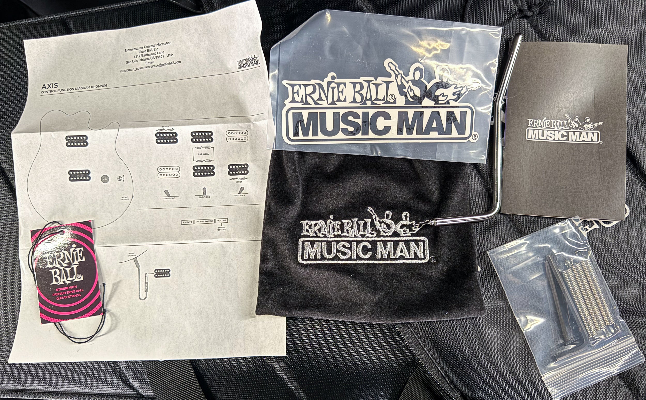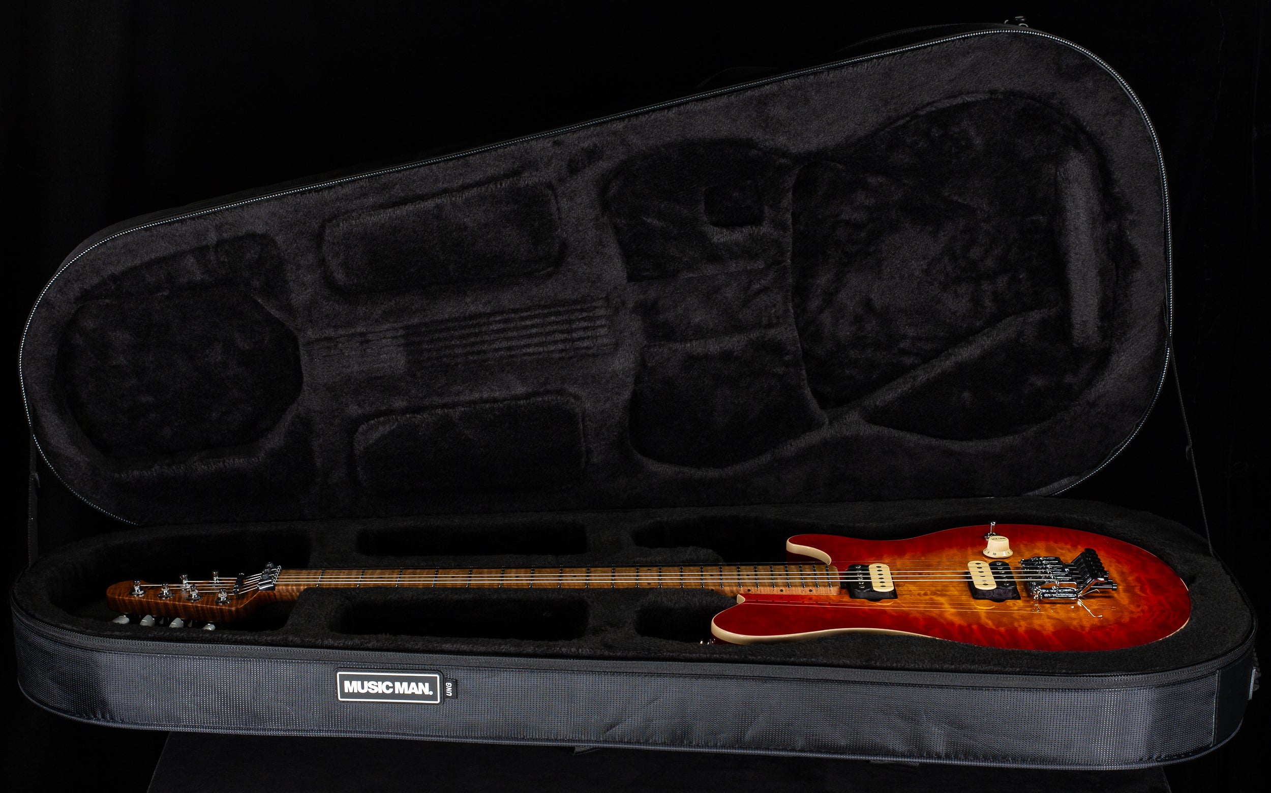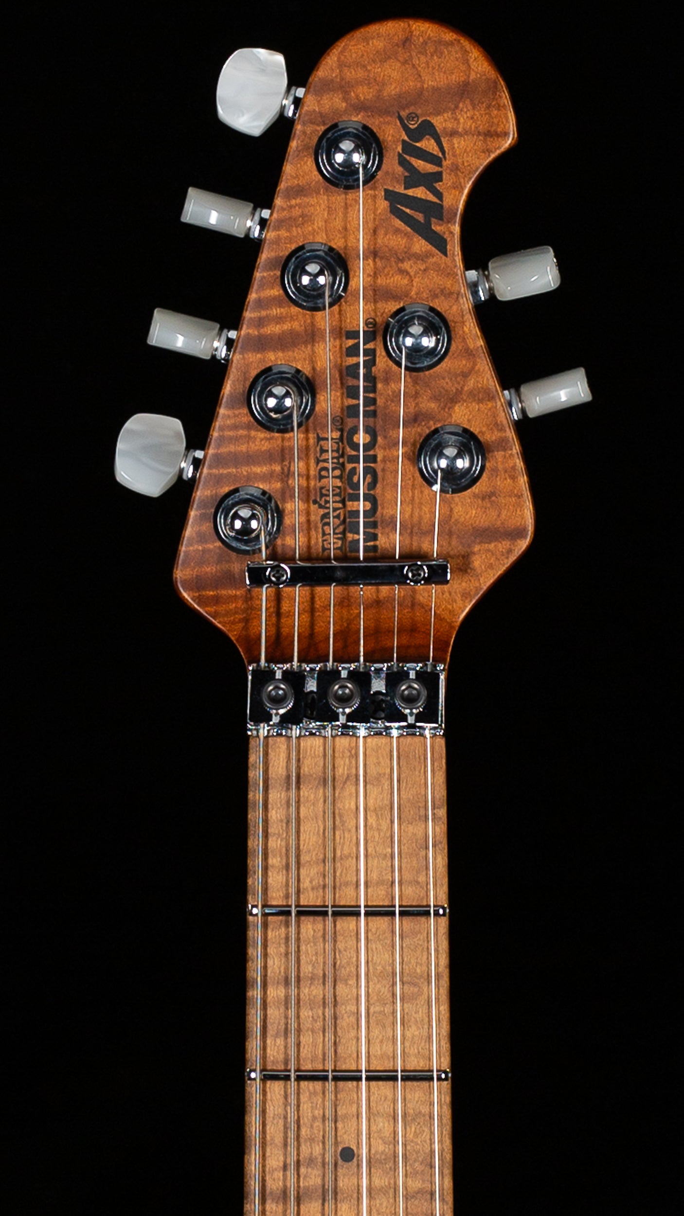 The Axis guitar features a beautiful quilt or flame maple veneer over a lightweight body. Two medium output custom DiMarzio humbuckers are mounted directly to the body for optimum resonance and signal response. This tonewood / pickup combination is a perfect recipe for hard edge rock tones, but also delivers a subtle dynamic response at lower volume levels when needed. The Axis asymmetric hard rock maple neck allows for comfortable hand positions across all 22 frets, while the double locking Music Man Floyd Rose tremolo keeps the guitar perfectly in tune.