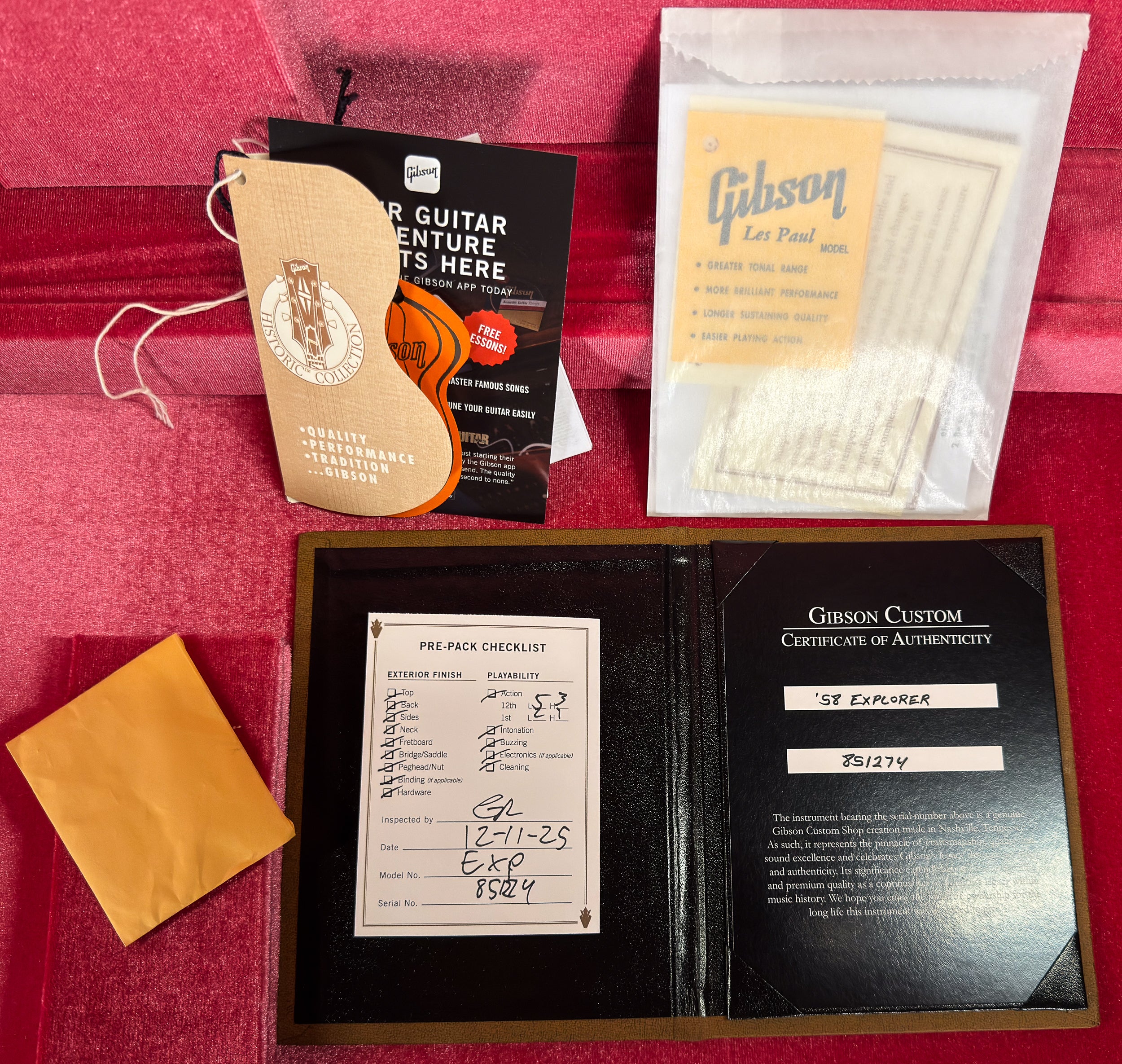 Radically “space age” in appearance when it was introduced in 1958, the Explorer was way ahead of its time and still looks fresh, modern, and unique today. This is a testament to its enduring appeal and timeless design, which continue to captivate guitarists and collectors worldwide. Now, Gibson Custom is proud to introduce the 1958 Mahogany Explorer Reissue. It features all of the hallmarks of the original Explorers from 1958, with the only difference being that mahogany has been used instead of the original, rare Korina wood, but otherwise, all of the classic vintage Explorer features have been carefully recreated in this Historic Reissue model. Mahogany delivers a somewhat warmer sound than the slightly brighter Korina, making it a great choice for players who love the 1950s Explorer aesthetic but who are looking for a denser, all-mahogany tone for rock and metal. And since mahogany is more readily available than the scarcer Korina, this also makes this 1958 Mahogany Explorer Reissue the most accessible way to get Historic Explorer looks, features, and performance from Gibson Custom.