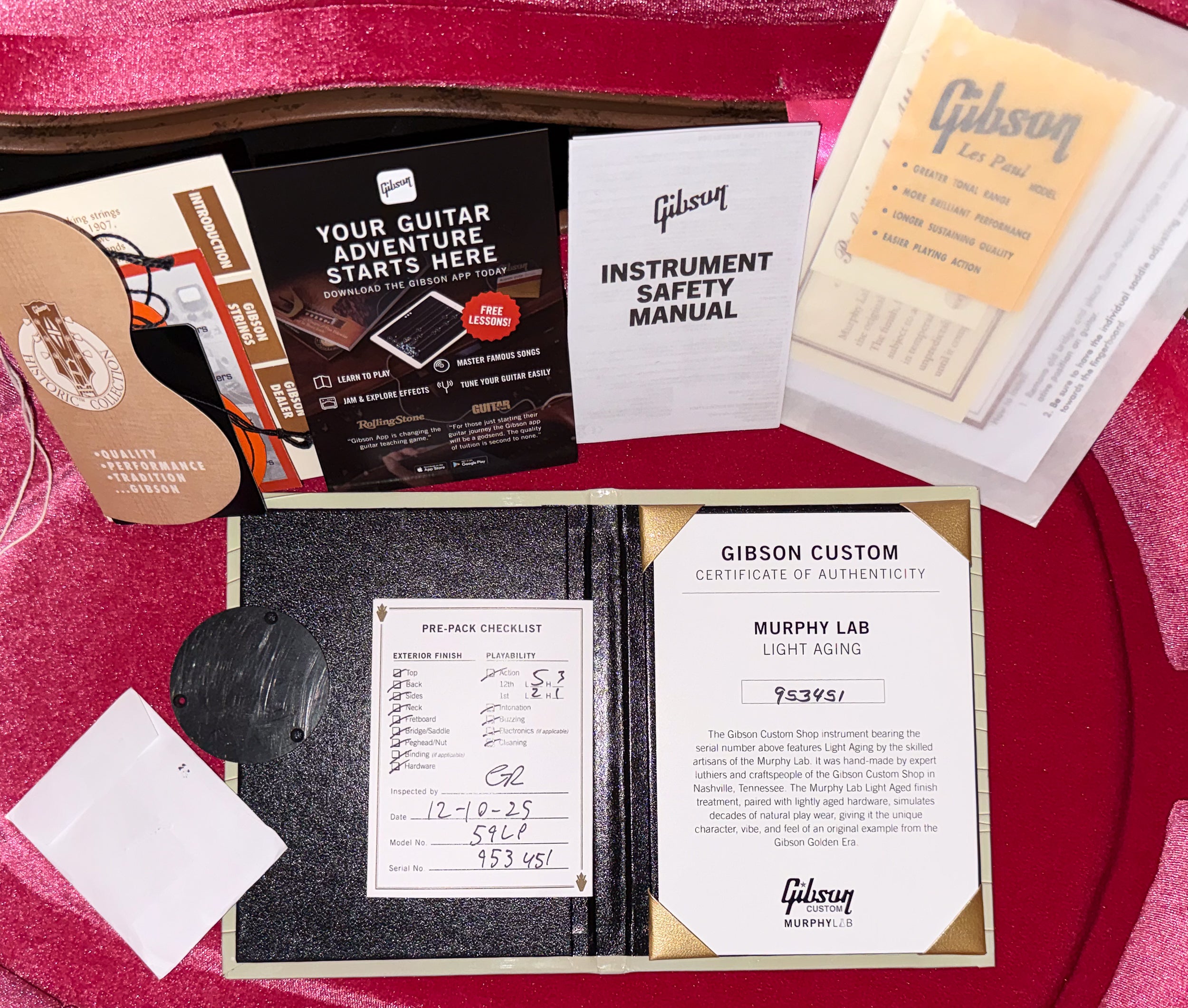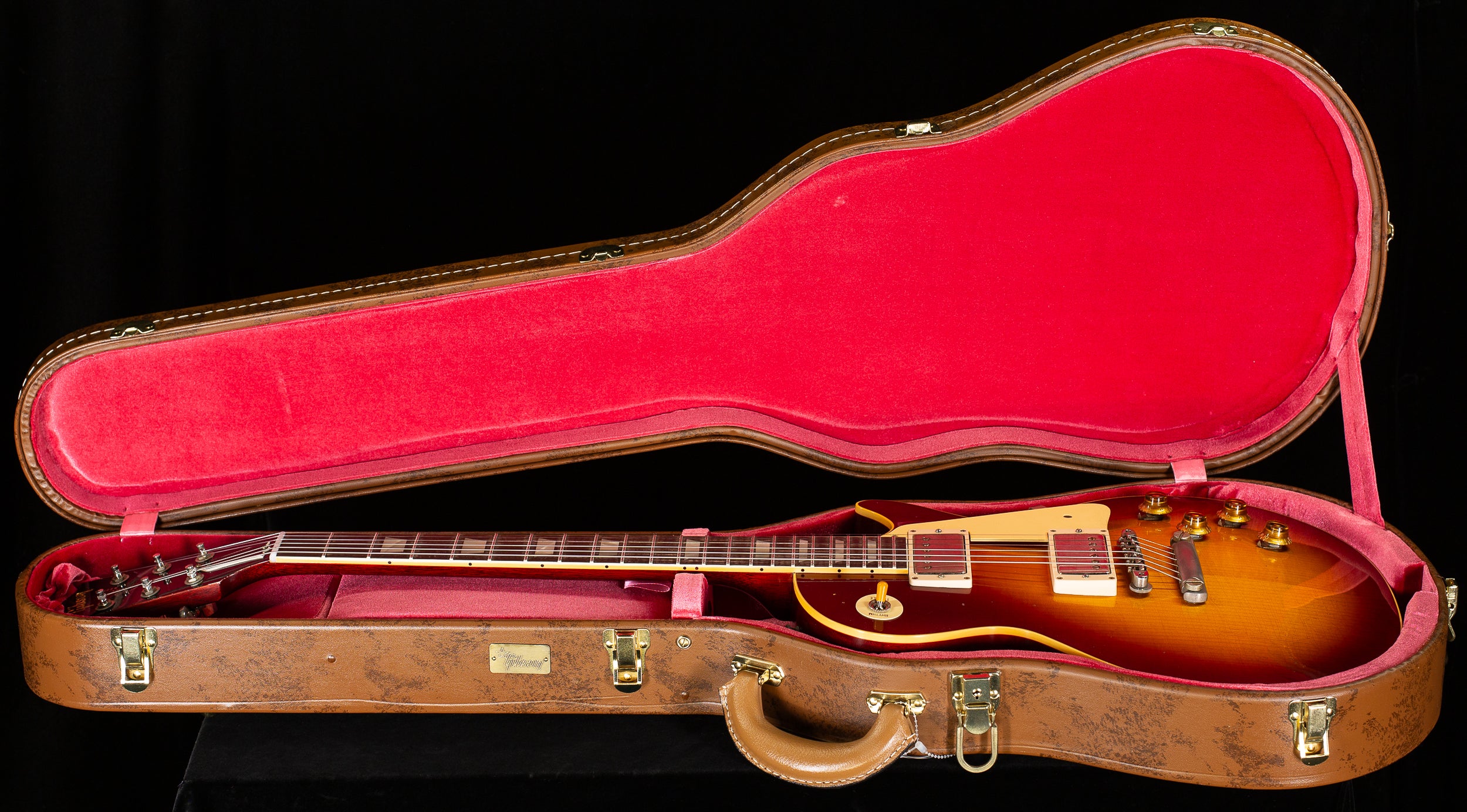 It features a lightweight mahogany body with a hand-selected plain maple top, an authentic 1959 Medium C mahogany neck, and a rosewood fingerboard with cellulose trapezoid inlays. A pair of Gibson Custombucker humbuckers delivers classic late-’50s PAF-style tone with warmth, clarity, and dynamic response.