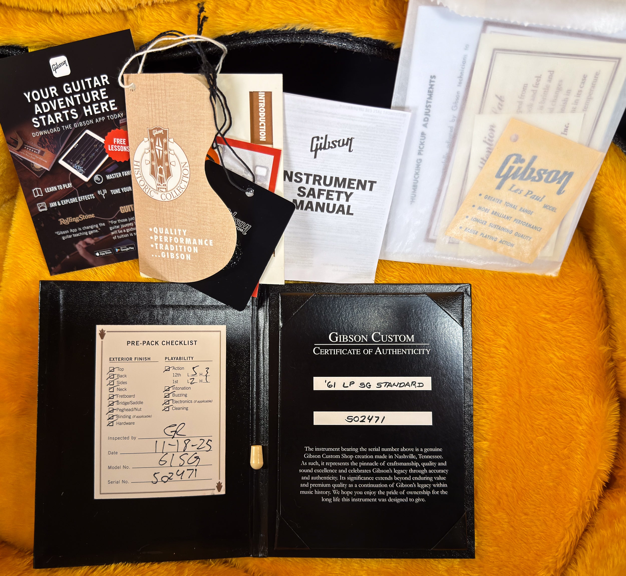 A true one-off Gibson Custom Shop build, this 1961 SG Standard Brunswick Orange Gloss is equal parts vintage soul and modern Custom Shop artistry—an instrument designed to stand out on stage, in the studio, and in any serious collection.