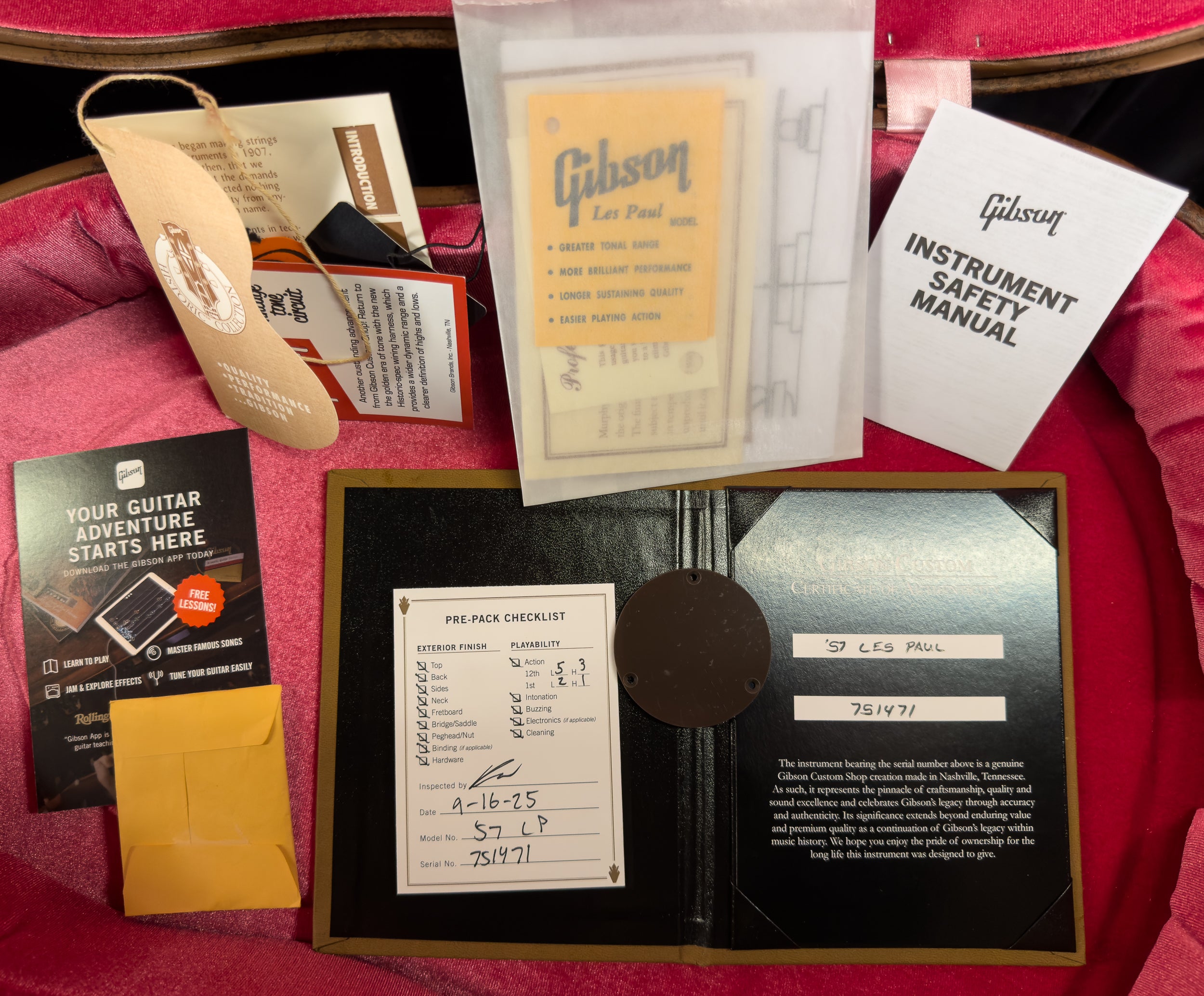 A pair of Custombucker Alnico 3 pickups (unpotted) deliver true late-’50s PAF clarity and warmth, controlled via hand-wired CTS 500K pots and paper-in-oil capacitors. Period-correct appointments include a No-Wire ABR-1 bridge, lightweight aluminum stop bar, Kluson Single Line tuners, and amber Catalin switch tip.