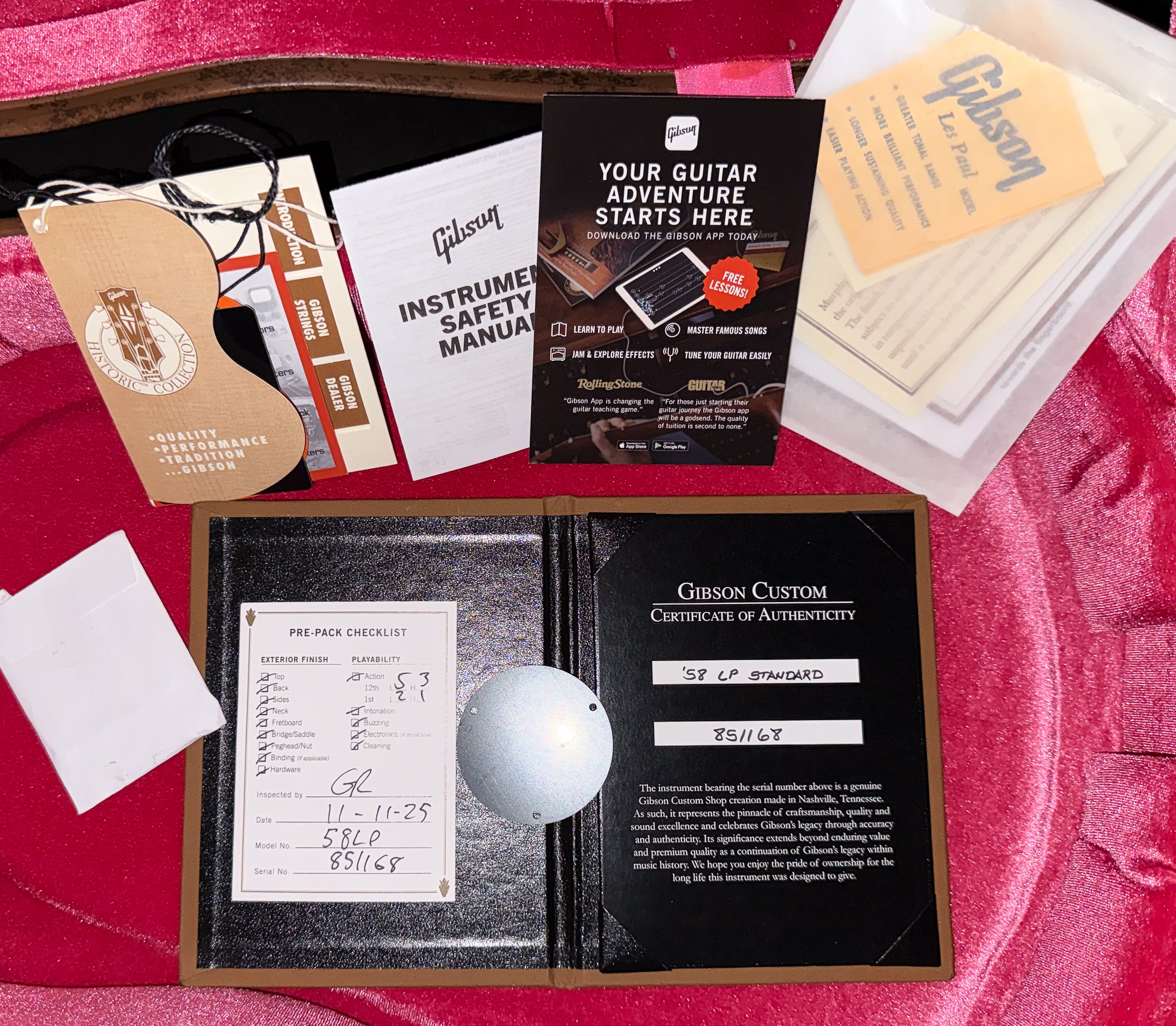 Under the hood, a matched set of Custombucker Alnico 3 (unpotted) pickups delivers the dry, woody clarity and vintage bloom of a true late-’50s PAF. Period-correct details—Royalite binding, gold butyrate knobs, M69 rings, no-wire ABR-1, lightweight aluminum stop bar, and nickel hardware—complete an instrument built with total historic accuracy.