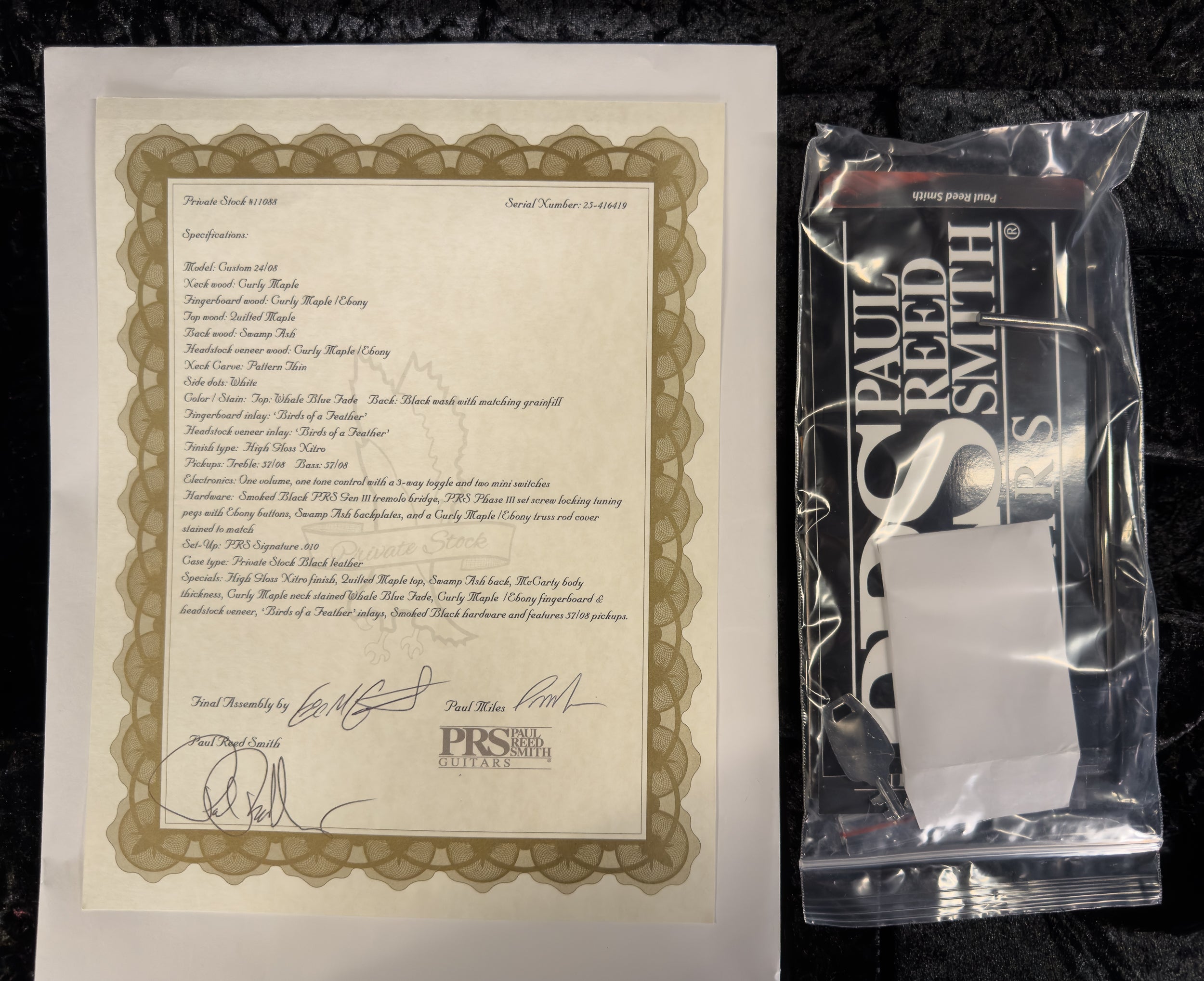 This PRS Private Stock Custom 24/08 is a showcase of the finest woods, finishes, and craftsmanship from the Private Stock team. Built with a Quilted Maple top, Swamp Ash back, and a neck, fingerboard, and headstock veneer carved from highly figured Curly Maple/Ebony, this instrument blends striking aesthetics with elite tonal response. Finished in a deep High Gloss Nitro, the guitar features a Whale Blue Fade top paired with a Black Wash back and matching grainfill, delivering dramatic contrast and depth.