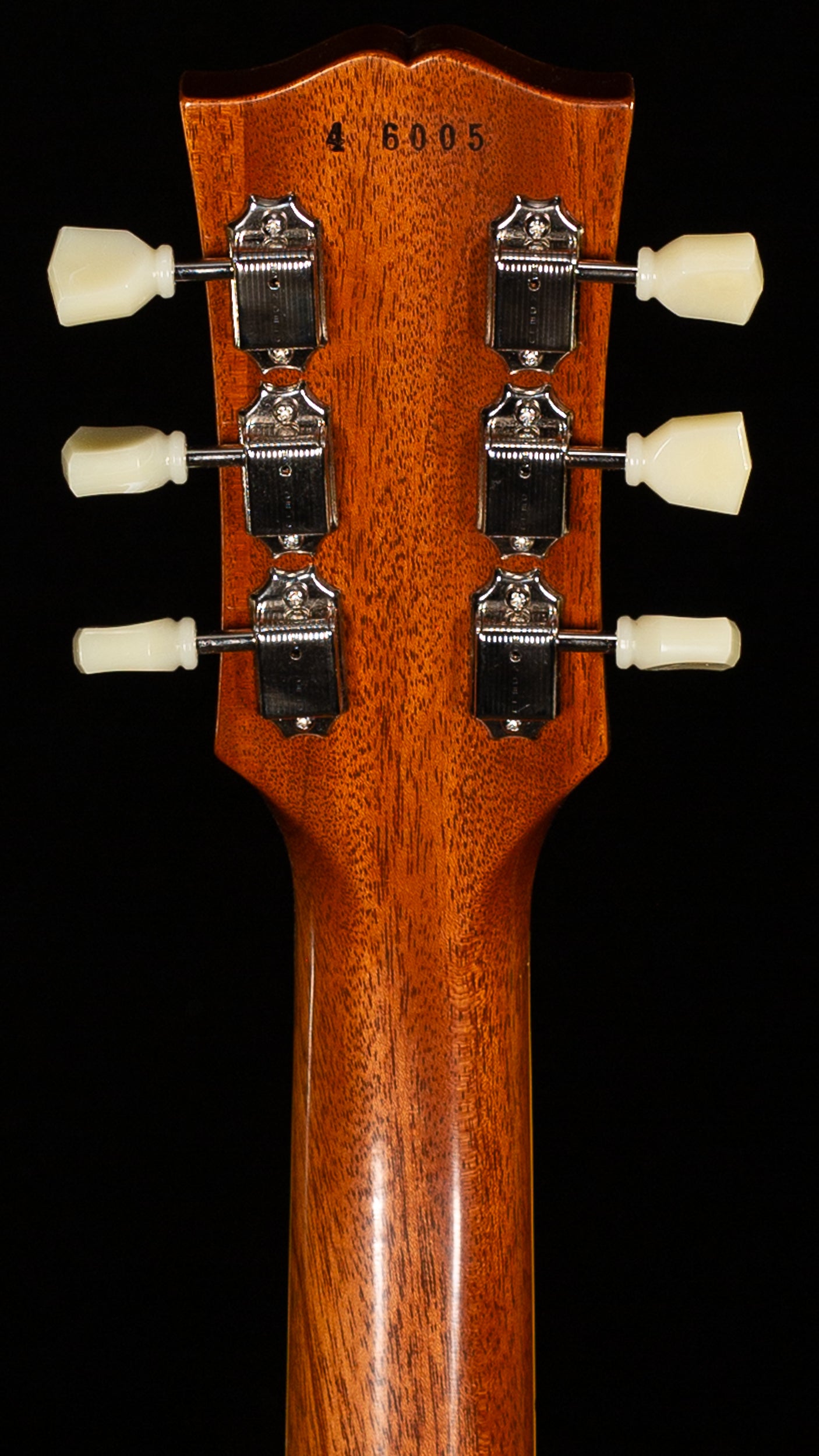 Crafted with a 2-piece plain maple top joined to a solid mahogany body using hide glue construction, the guitar delivers exceptional sustain and harmonic depth. The VOS nitrocellulose finish lends it a lightly aged patina reminiscent of well-preserved vintage examples. Its Indian rosewood fingerboard, also hide-glued, adds warmth and clarity to the tone, complemented by aged cellulose nitrate trapezoid inlays and historic narrow/tall frets for authentic playability.