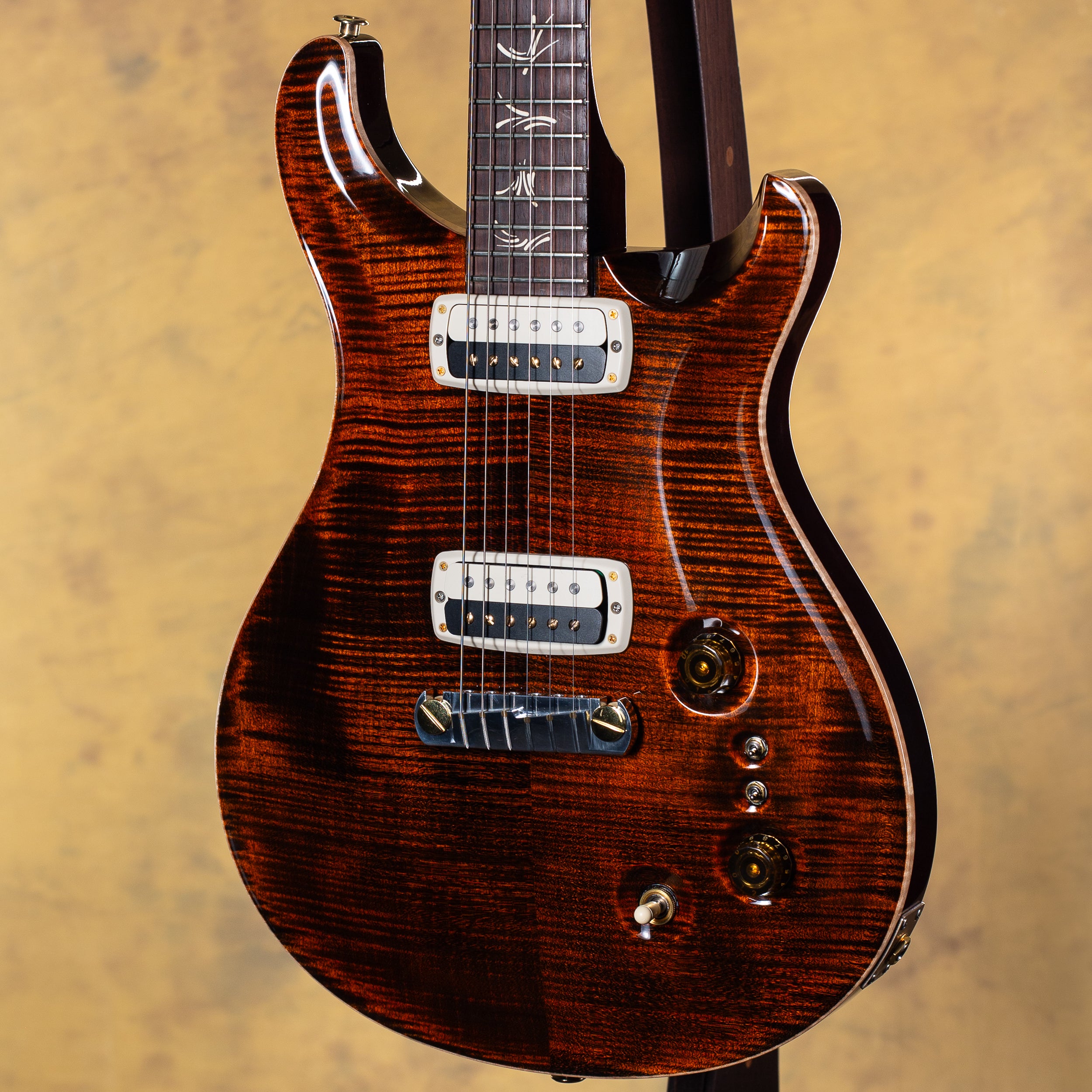 A 2022 PRS Paul’s Guitar in Orange Tiger with a Flame Maple 10-Top — a refined, tone-focused instrument designed in collaboration with Paul Reed Smith himself. Known for its exceptional clarity and versatility, this model features TCI pickups and dual mini-toggle coil taps, allowing for a wide range of articulate humbucking and single-coil tones. The carved figured maple top and mahogany back deliver classic PRS resonance with striking visual appeal.