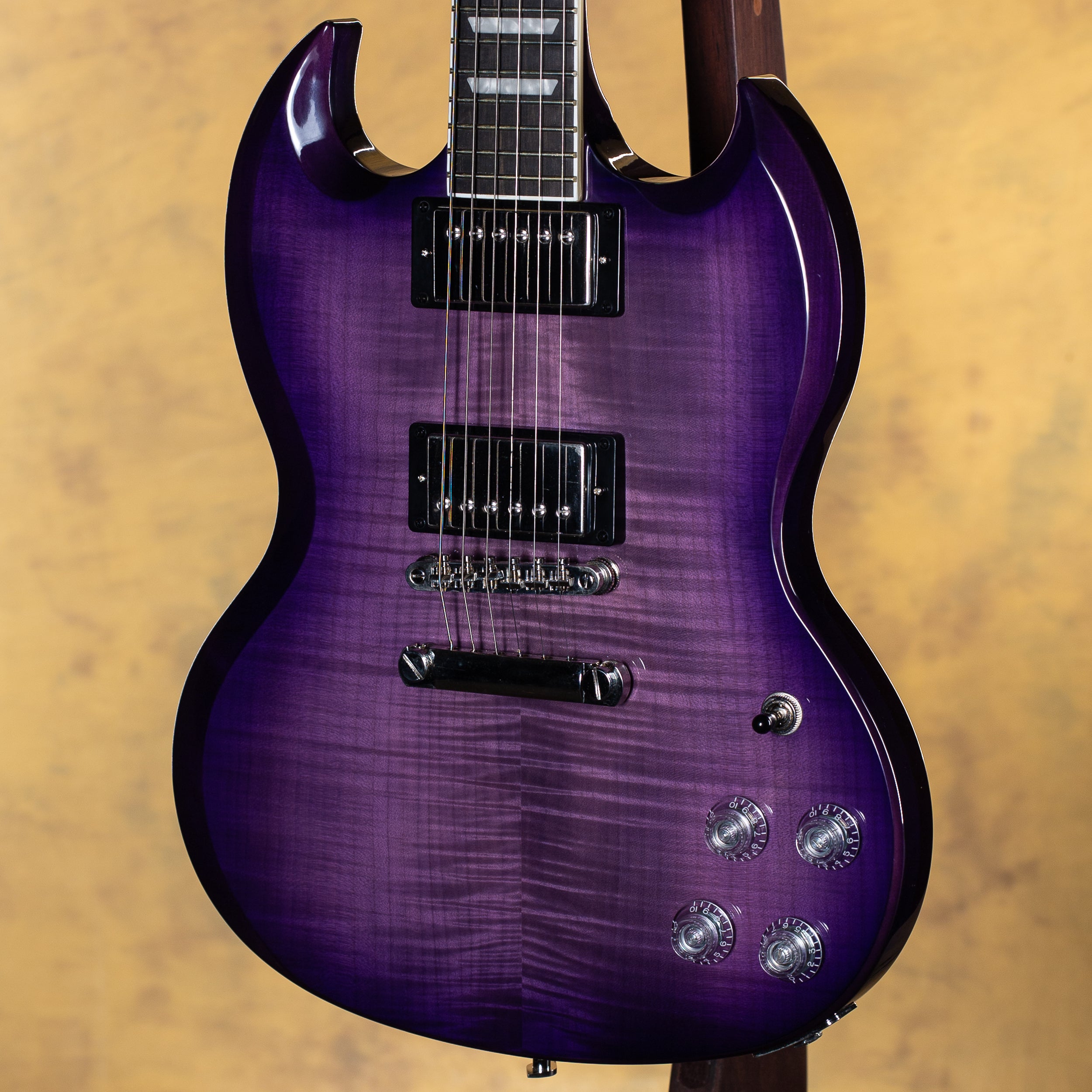 A 2023 Epiphone SG Modern Figured in Purple Burst, this sleek and aggressive take on the classic SG platform combines modern playability with eye-catching looks. Built with a mahogany body and topped with AAA flamed maple veneer, it delivers punchy mids with added clarity and snap. The asymmetrical SlimTaper neck offers fast, comfortable playability, while ProBucker pickups with coil-splitting and phase switching provide a wide range of tones from classic humbucker growl to more articulate single-coil textures.