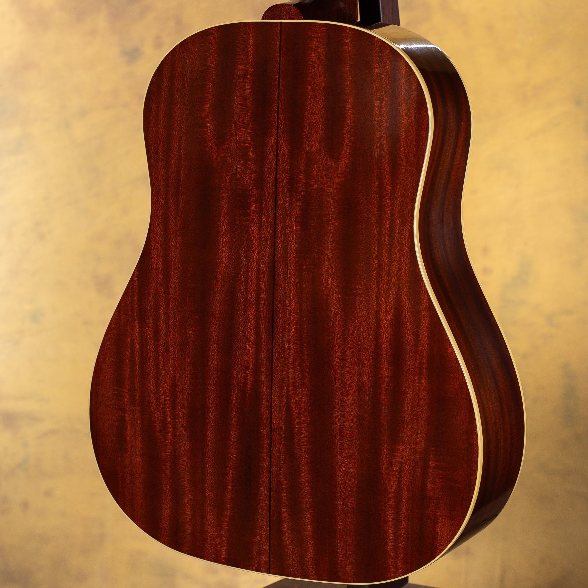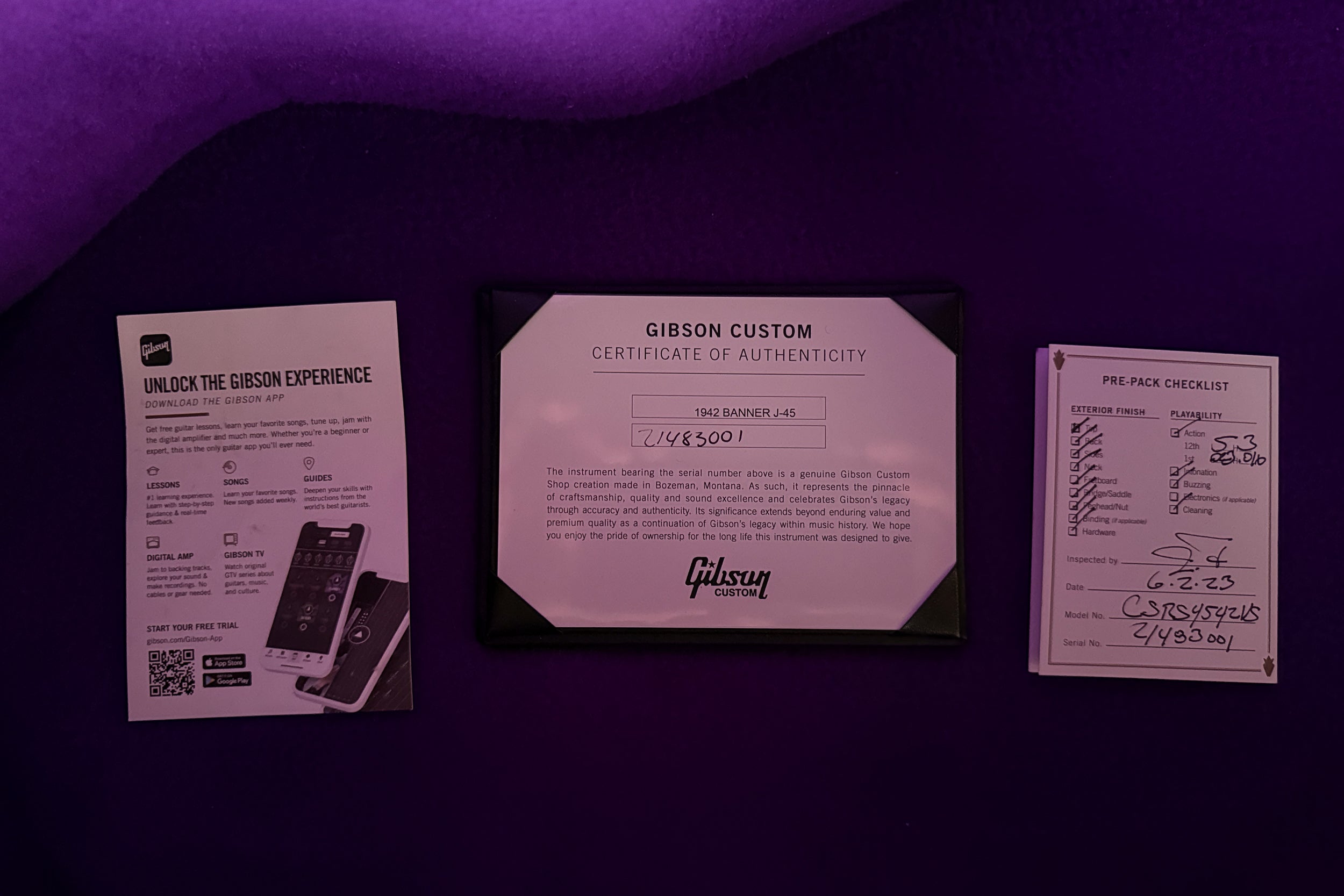 A 2023 Gibson Custom Shop Historic 1942 Banner J-45, this faithful recreation captures the warm, dry, and woody tone that made the original Banner-era J-45s legendary. Built with a thermally aged red spruce top and mahogany back and sides, it delivers a rich, responsive voice with excellent fundamental clarity and vintage character. The VOS nitro finish and hand-scalloped bracing enhance resonance, while the Historic neck profile provides a comfortable, period-correct feel.