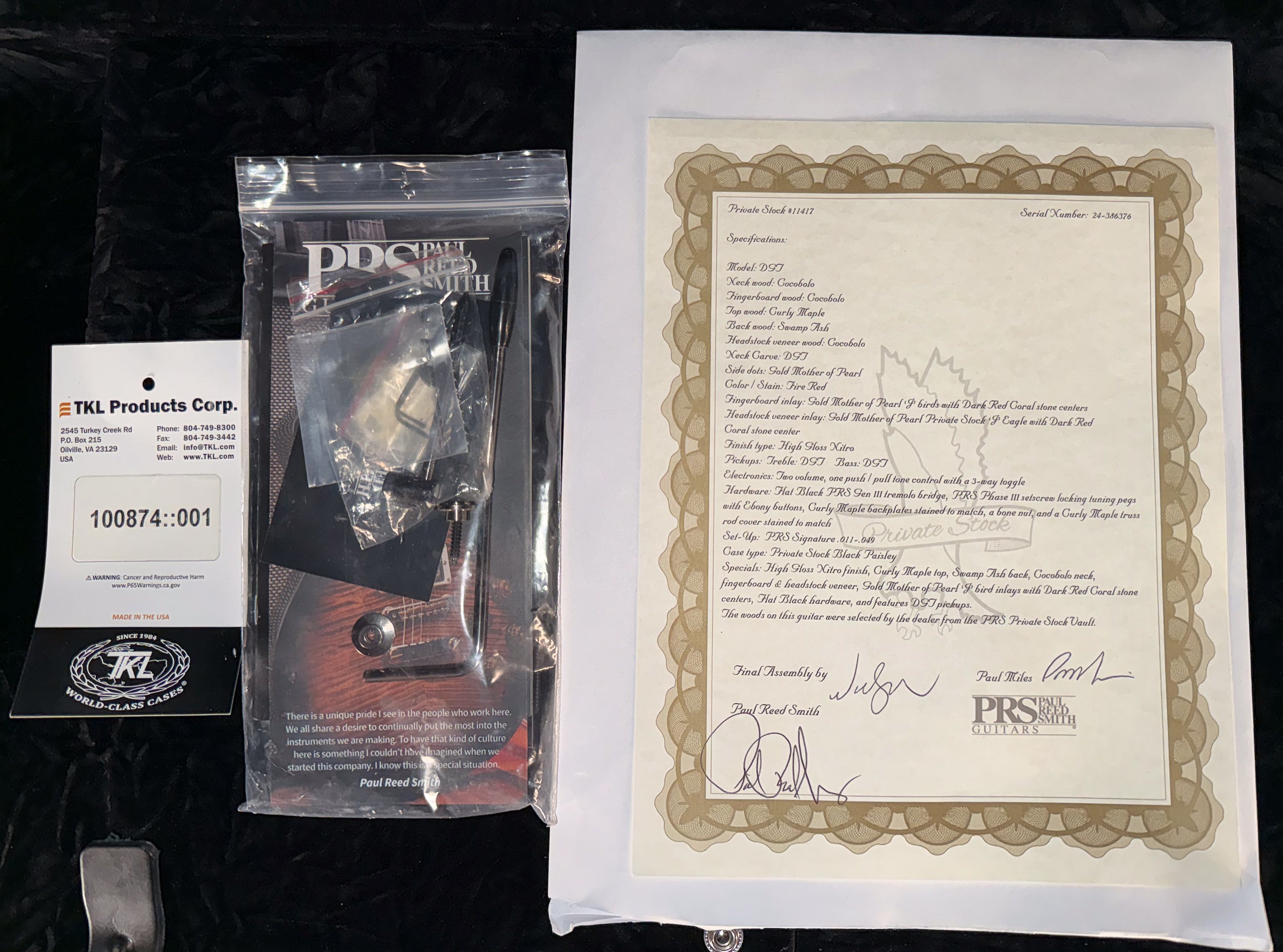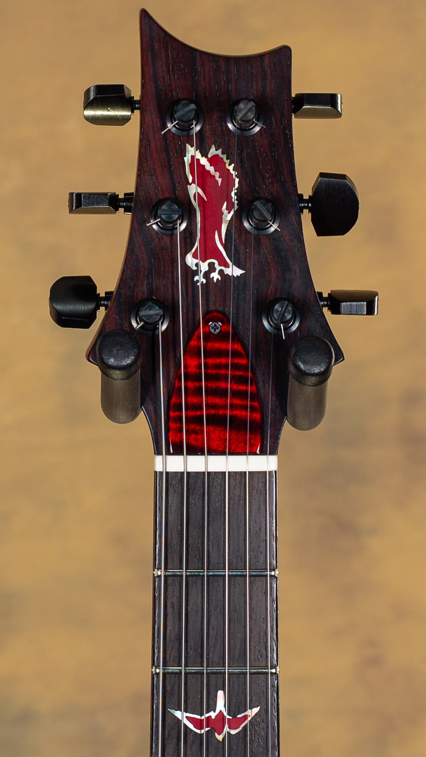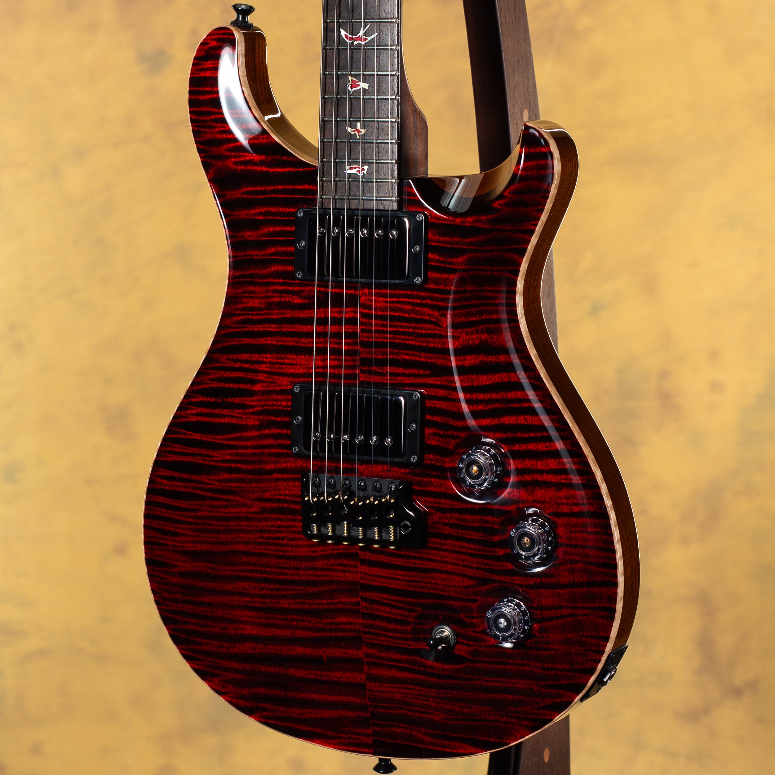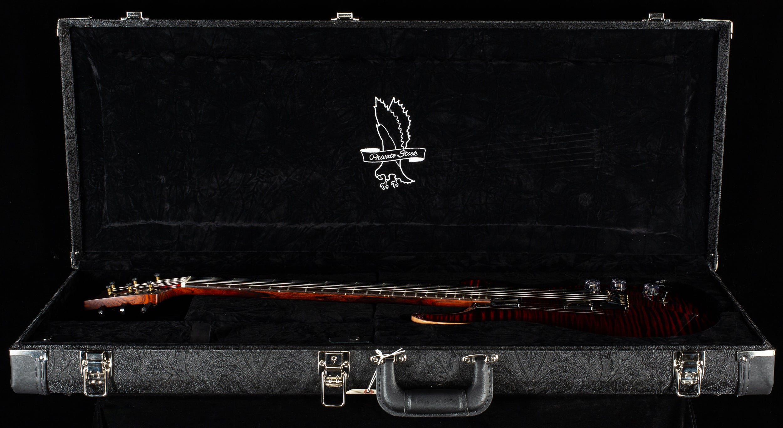 A stunning 2024 PRS Private Stock DGT finished in Fire Red, showcasing extraordinary tonewoods, elite craftsmanship, and meticulous Private Stock detail throughout. With a curly maple top over a swamp ash back and a rare cocobolo neck, fingerboard, and headstock veneer, this DGT delivers exceptional resonance, clarity, and feel. Elegant gold mother-of-pearl bird inlays with dark coral stone centers and flat black hardware complete a truly top-tier Private Stock build.