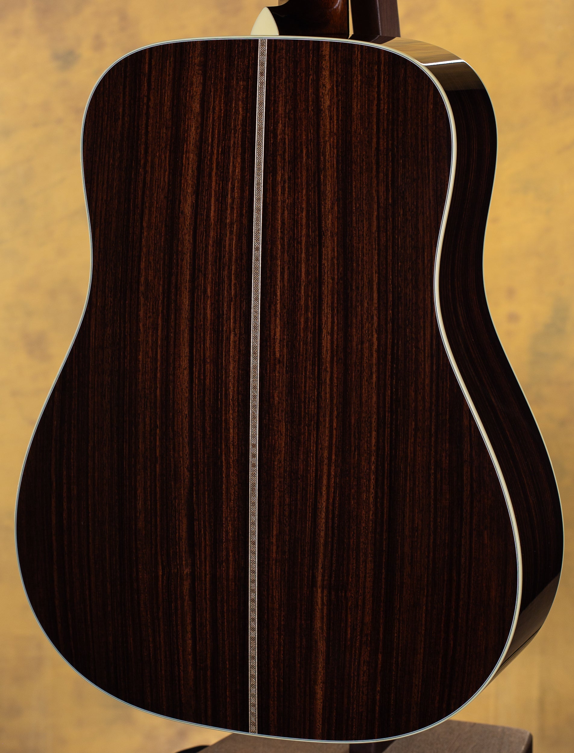 his Collings-style acoustic features premium tonewoods and master craftsmanship. With its old growth Sitka spruce top and East Indian rosewood back and sides, it delivers a powerful, articulate voice rich in clarity and projection. Appointments like ivoroid binding with herringbone purfling, abalone inlays, and nickel Waverly tuners give it a timeless, elegant look, while the pre-war scalloped X-bracing ensures classic resonance. A true heirloom-quality instrument.