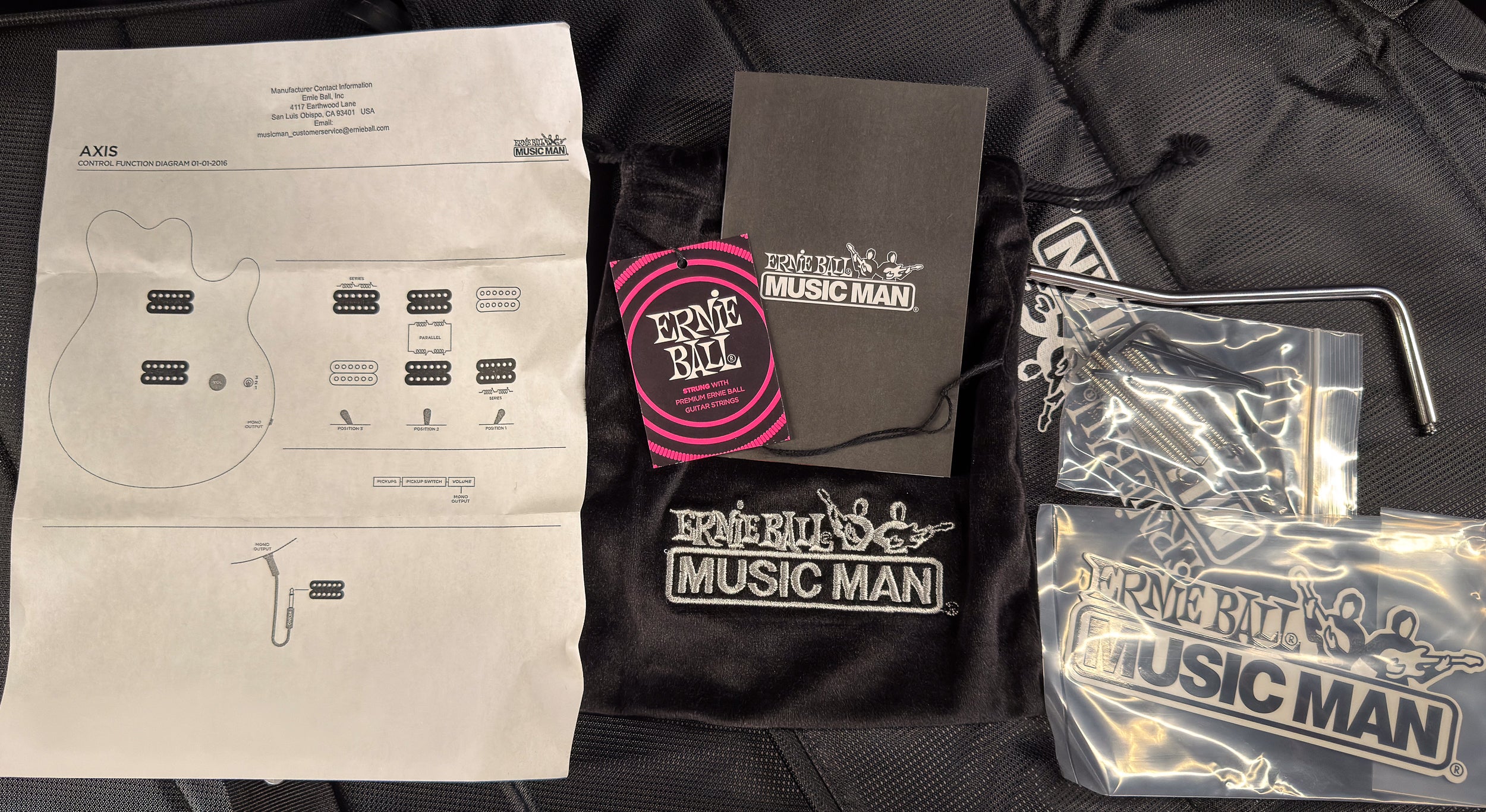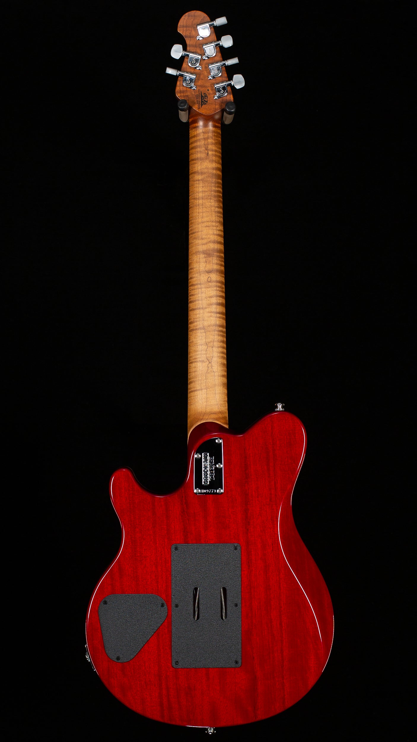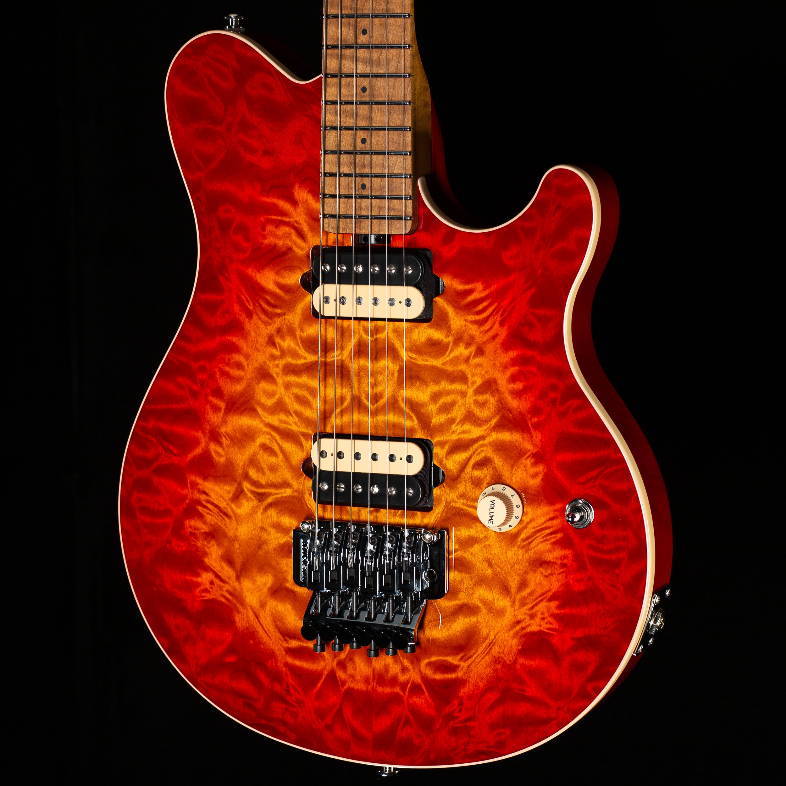 The Axis guitar features a beautiful quilt or flame maple veneer over a lightweight body. Two medium output custom DiMarzio humbuckers are mounted directly to the body for optimum resonance and signal response. This tonewood / pickup combination is a perfect recipe for hard edge rock tones, but also delivers a subtle dynamic response at lower volume levels when needed. The Axis asymmetric hard rock maple neck allows for comfortable hand positions across all 22 frets, while the double locking Music Man Floyd Rose tremolo keeps the guitar perfectly in tune.