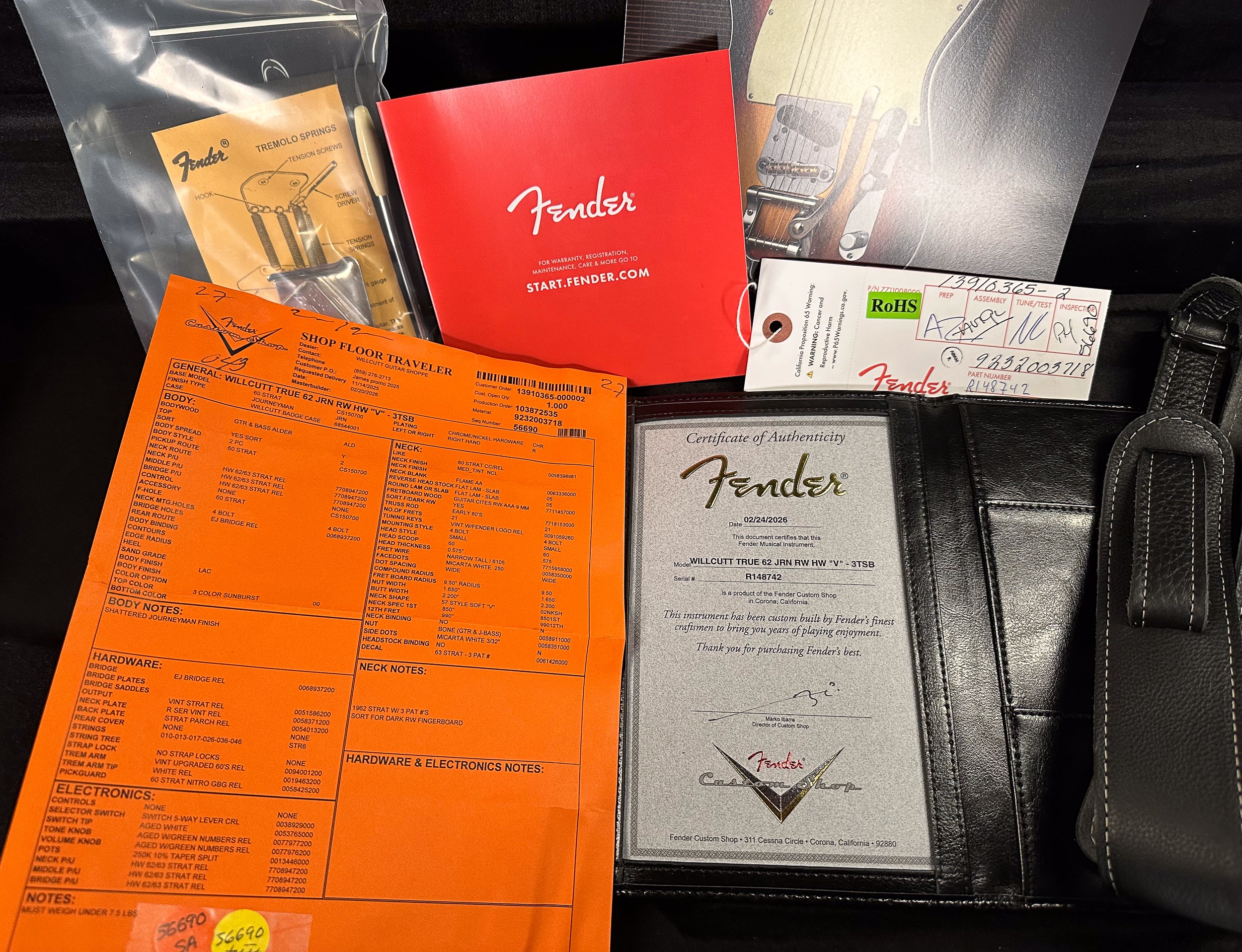 "If there is one guitar that represents modern music of all genres, it is the iconic Fender Stratocaster. Thousands have passed through Willcutt Guitars in the 50 years that we have been selling, restoring , and placing in the hands of enthusiastic players One stands out as the most exceptional in tone, playability, and overall musical stability. That is the 62 3tsb/rw serial number 79498 that is now owned by the great blues player Eugene Woods. Since there is only that one, and others want to experience the sound and feel of the original, we commissioned the Fender Custom Shop to make precise reproductions with a limited run only available at Willcutt Guitars.The pickups were custom wound, sweet and full bodied, to match the 79498 specs and the neck fit, thin, worn, finish. A custom embroidered Custom Shop logo is on the case interior as well as the custom Willcutt Guitars metal plaque." - Bob Willcutt