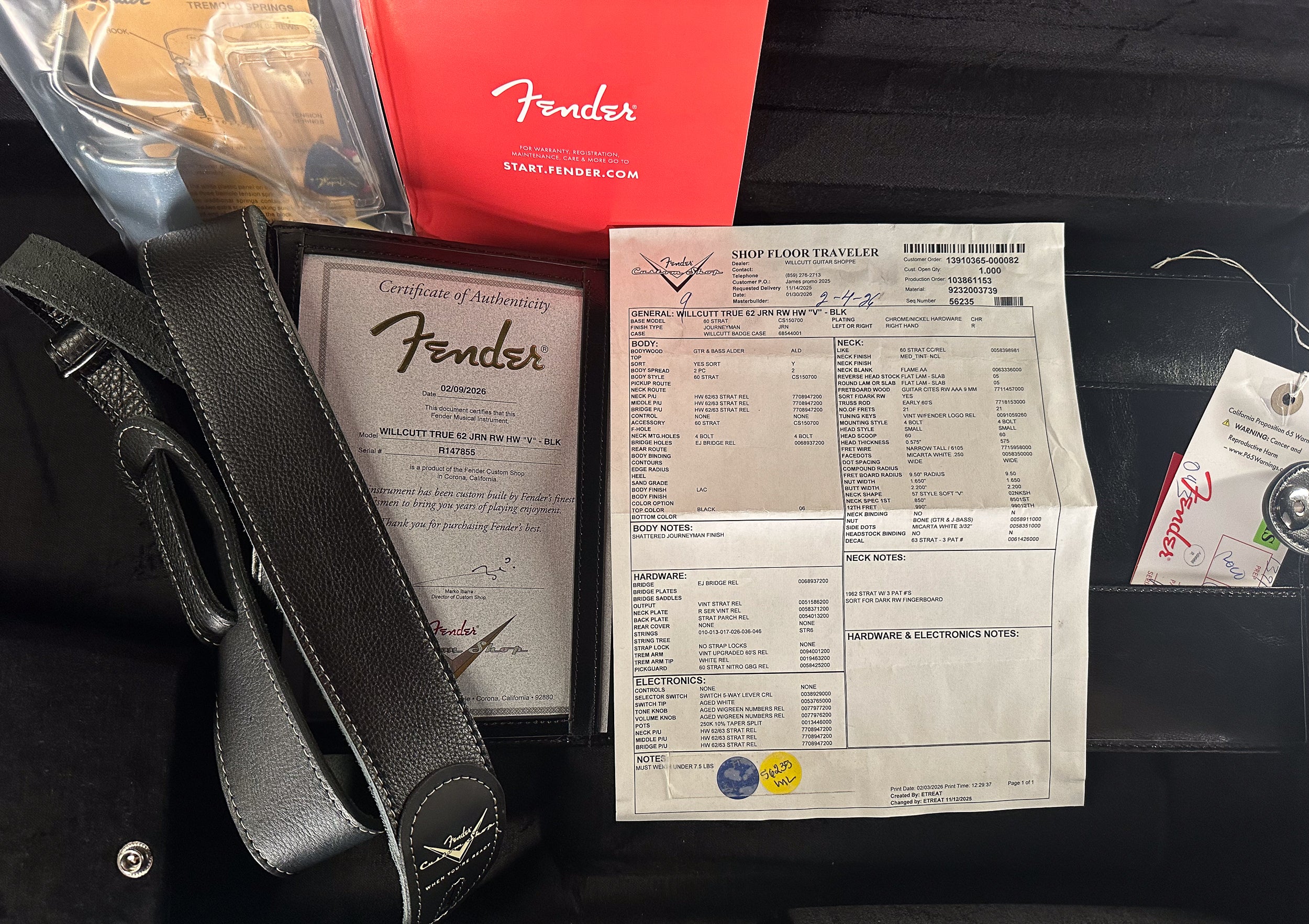 "If there is one guitar that represents modern music of all genres, it is the iconic Fender Stratocaster. Thousands have passed through Willcutt Guitars in the 50 years that we have been selling, restoring , and placing in the hands of enthusiastic players One stands out as the most exceptional in tone, playability, and overall musical stability. That is the 62 3tsb/rw serial number 79498 that is now owned by the great blues player Eugene Woods. Since there is only that one, and others want to experience the sound and feel of the original, we commissioned the Fender Custom Shop to make precise reproductions with a limited run only available at Willcutt Guitars.The pickups were custom wound, sweet and full bodied, to match the 79498 specs and the neck fit, thin, worn, finish. A custom embroidered Custom Shop logo is on the case interior as well as the custom Willcutt Guitars metal plaque." - Bob Willcutt