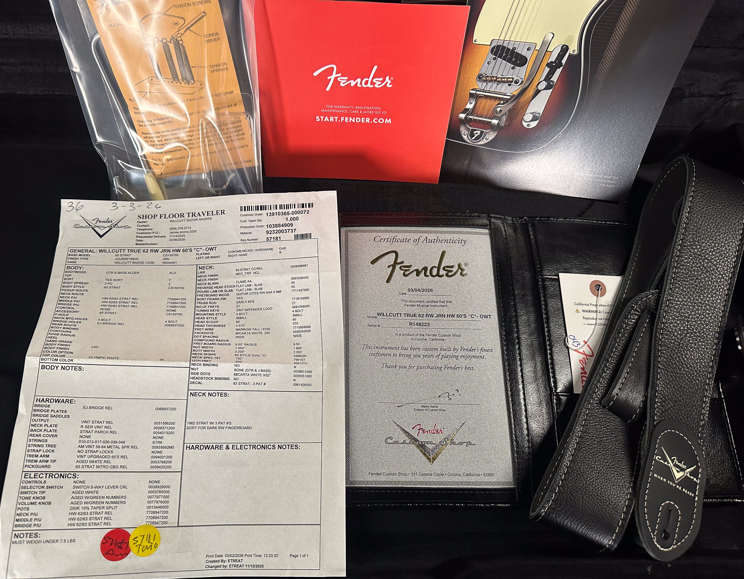 "If there is one guitar that represents modern music of all genres, it is the iconic Fender Stratocaster. Thousands have passed through Willcutt Guitars in the 50 years that we have been selling, restoring , and placing in the hands of enthusiastic players One stands out as the most exceptional in tone, playability, and overall musical stability. That is the 62 3tsb/rw serial number 79498 that is now owned by the great blues player Eugene Woods. Since there is only that one, and others want to experience the sound and feel of the original, we commissioned the Fender Custom Shop to make precise reproductions with a limited run only available at Willcutt Guitars.The pickups were custom wound, sweet and full bodied, to match the 79498 specs and the neck fit, thin, worn, finish. A custom embroidered Custom Shop logo is on the case interior as well as the custom Willcutt Guitars metal plaque." - Bob Willcutt