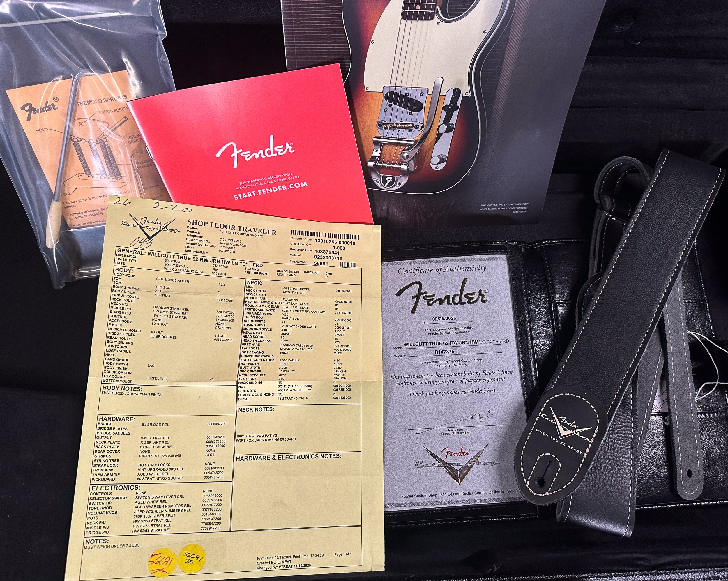 "If there is one guitar that represents modern music of all genres, it is the iconic Fender Stratocaster. Thousands have passed through Willcutt Guitars in the 50 years that we have been selling, restoring , and placing in the hands of enthusiastic players One stands out as the most exceptional in tone, playability, and overall musical stability. That is the 62 3tsb/rw serial number 79498 that is now owned by the great blues player Eugene Woods. Since there is only that one, and others want to experience the sound and feel of the original, we commissioned the Fender Custom Shop to make precise reproductions with a limited run only available at Willcutt Guitars.The pickups were custom wound, sweet and full bodied, to match the 79498 specs and the neck fit, thin, worn, finish. A custom embroidered Custom Shop logo is on the case interior as well as the custom Willcutt Guitars metal plaque." - Bob Willcutt