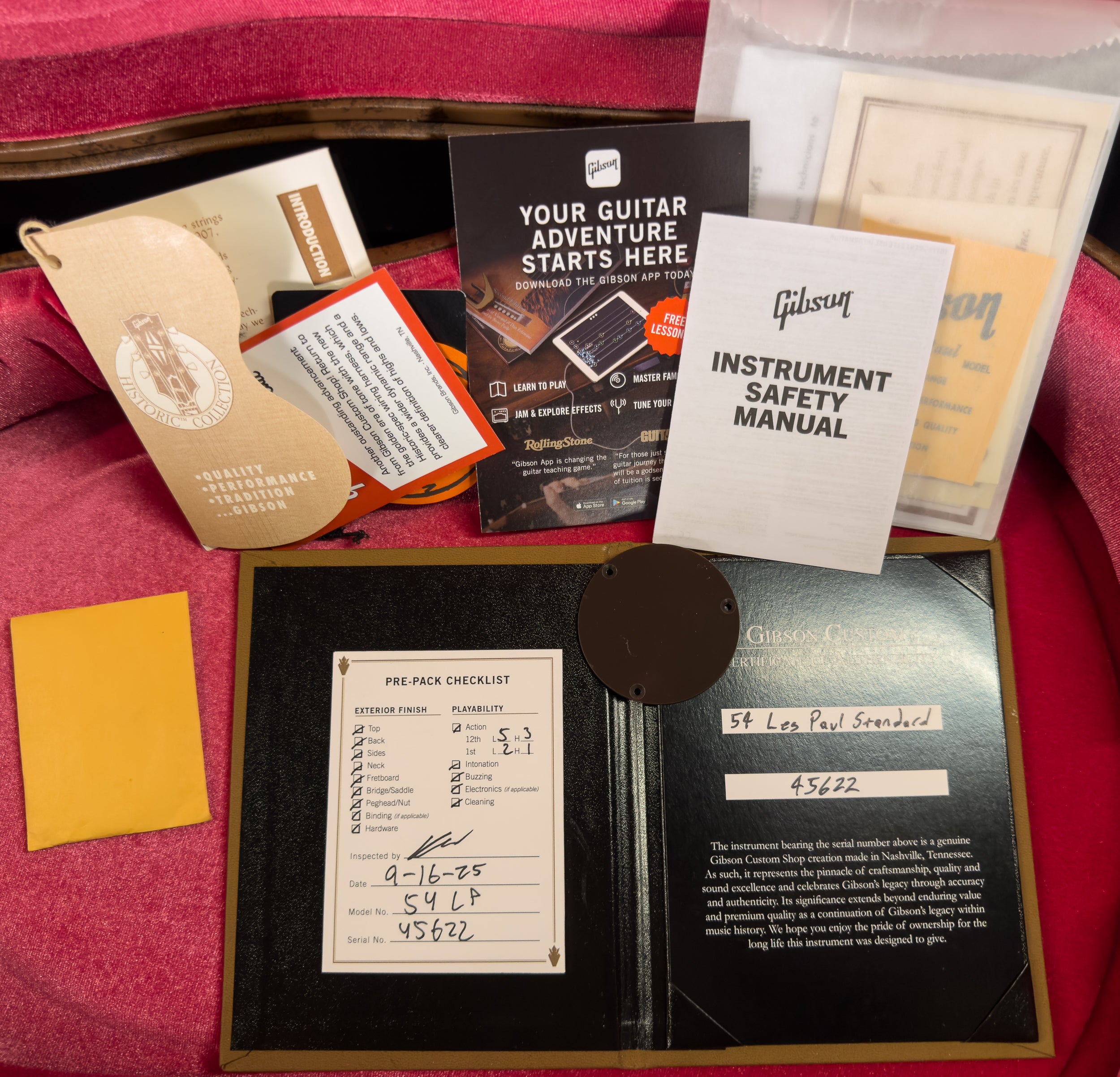 Included Accessories: Gibson Custom Switchplate Medallion (w/ Historic Brown Plastic Cover in Case), Certificate of Authenticity Booklet, Historic Reissue Hang Tags