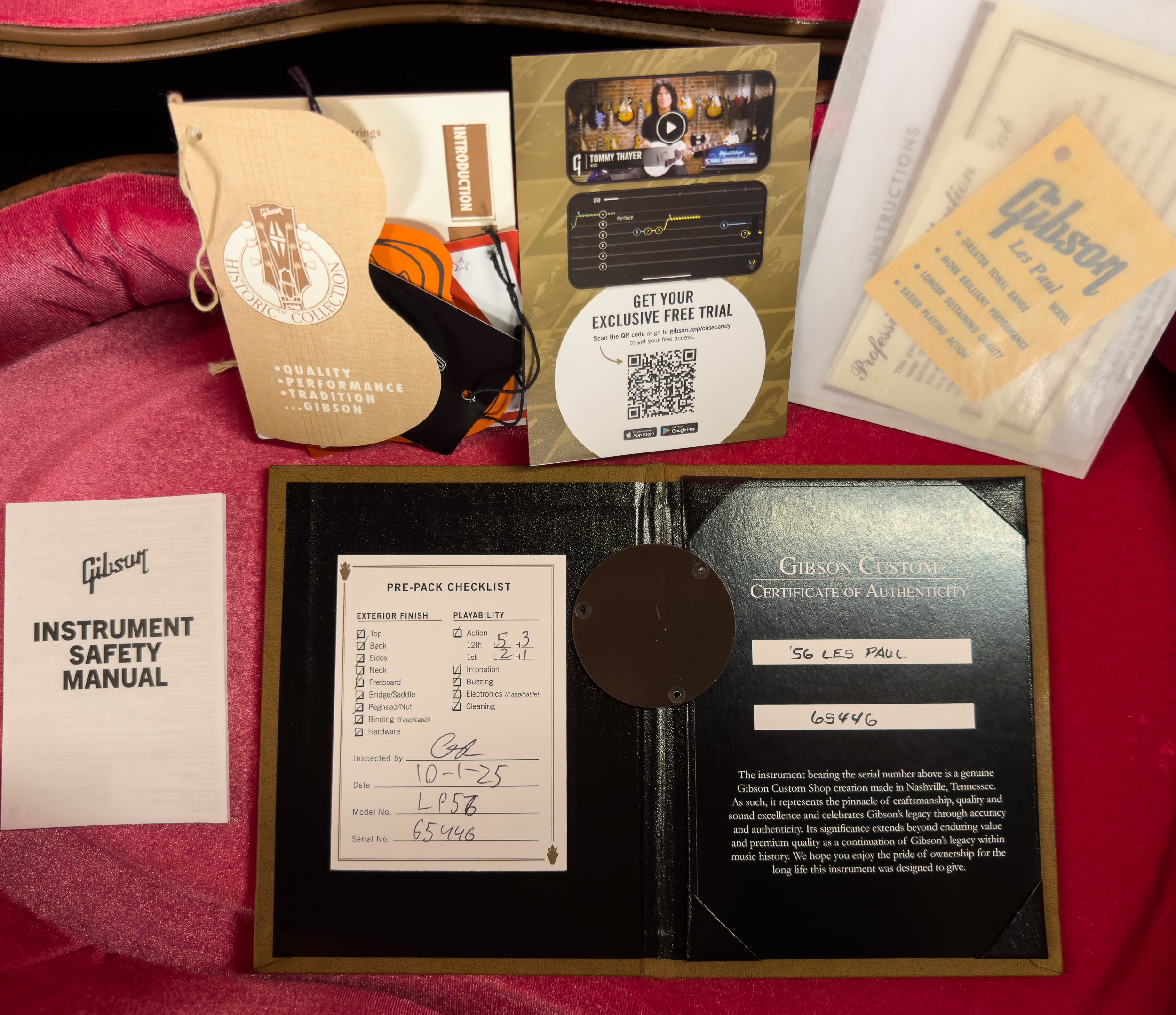 Included Accessories: Gibson Custom Switchplate Medallion (w/ Historic Brown Plastic Cover in Case), Certificate of Authenticity Booklet, Historic Reissue Hang Tags