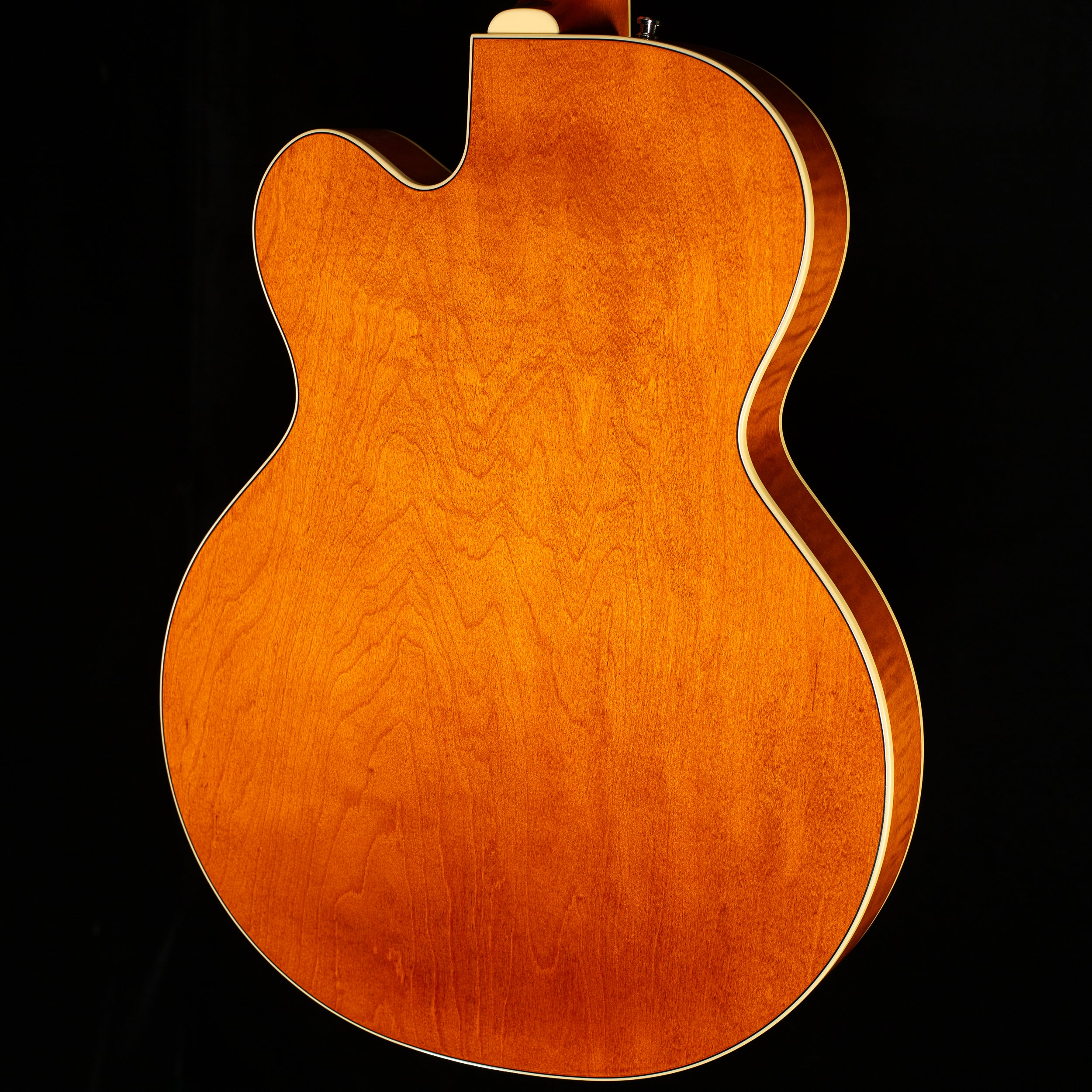 Honoring a pivotal rock 'n' roll legend, the G6120T-BSSMK Brian Setzer Signature Nashville Hollow Body '59 "Smoke" with Bigsby is a recreation of Brian's main stage guitar since retiring the famed 'Stray Cat.' A pain-staking homage to one of Brian's most treasured guitars, Smoke delivers vintage '59 vibe with powerhouse performance. Period-correct details abound including the '59 headstock shape and logo, pickguard shape, size, and bracket, volume, tone and switch locations and a beautifully rich "Smoke Orange" semi-gloss lacquer finish. Beneath its vintage cloak however, Smoke is a true workhorse with features accumulated over a prolific span of Brian's career. Stage-veteran specs include a single-cutaway hollow body with arched laminated maple top, 1959 trestle bracing and oversized F-holes for improved sonic projection. The maple neck has a 9.5"-12" compound radius ebony fingerboard and a vintage 'V' neck shape for comfortable chording or lightning leads. The rolled fingerboard and body edges couple with the semi-gloss finish to create an unparalleled broken-in feel found only in the prized G6120s from the 1950s. Dual TV Jones Ray Butts Ful-Fidelity pickups provide timeless tone with excellent bass response and shimmering Filter'Tron sparkle. For complete roadworthy stability, Smoke is equipped with an Adjusto-Matic bridge with pinned rosewood base, Bigsby B6CGH vibrato tailpiece, Delrin nut and Gotoh locking tuning machines.