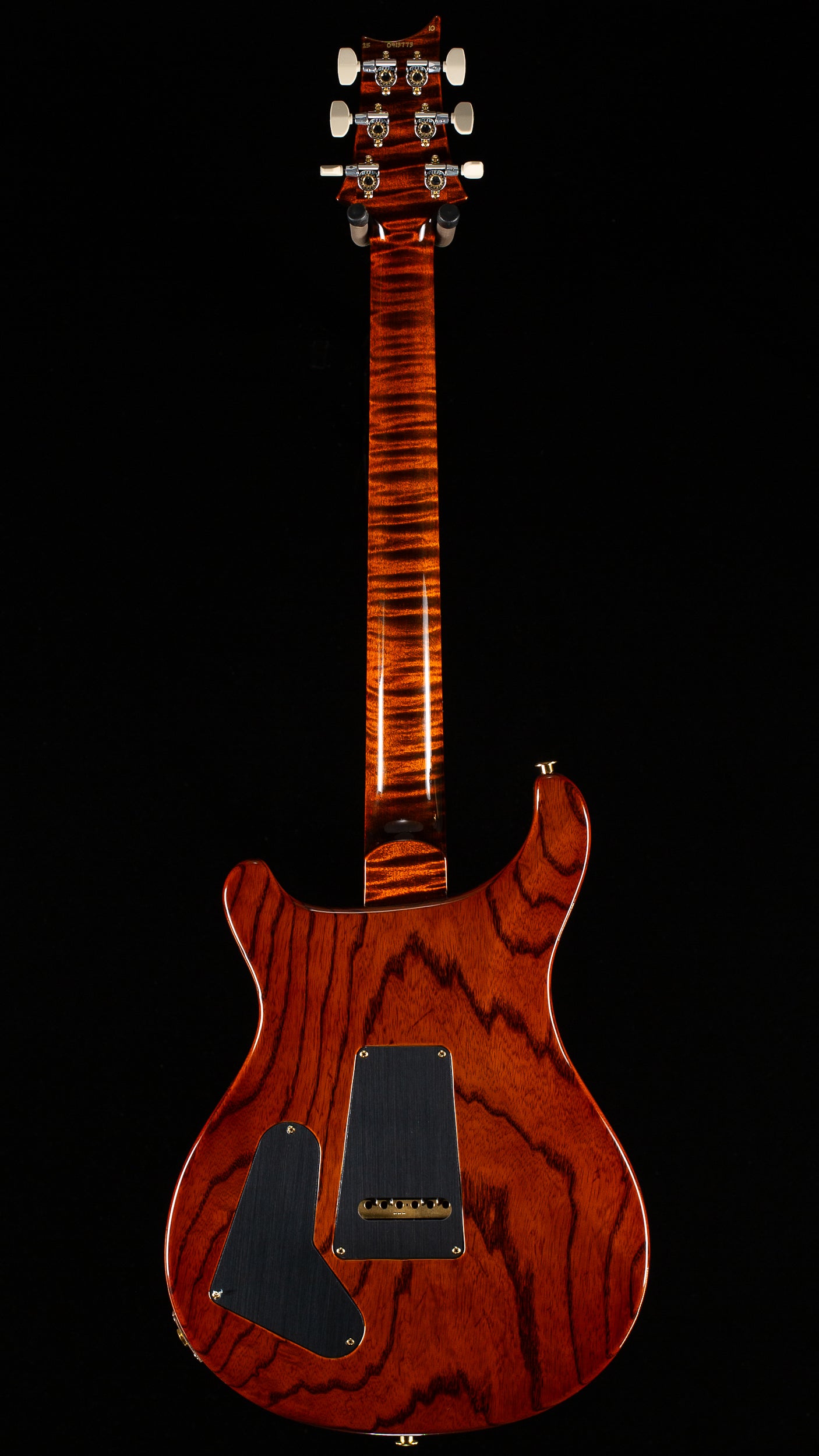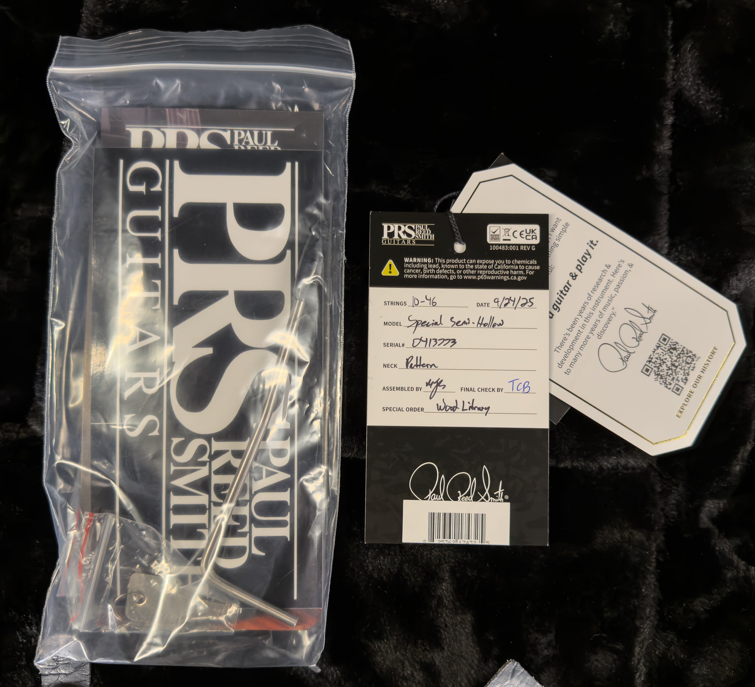 The PRS Wood Library Willcutt Exclusive Special Semi-Hollow 10 Top blends showpiece looks with pro-level versatility. A violin-carved 10 Top quilted maple cap over a mahogany back gives you snap, bloom, and warm sustain, while the semi-hollow body with single F-hole adds airy resonance and touch sensitivity. The one-piece flamed maple Pattern neck (matching stain) pairs with a Brazilian rosewood fingerboard (10" radius) for a smooth, fast feel, capped by MOP/Abalone outlined birds and an inlaid signature headstock. Hardware is dialed for reliability: PRS Gen III tremolo, Phase III locking tuners with wing buttons, and hybrid black appointments under a high-gloss nitro finish.
