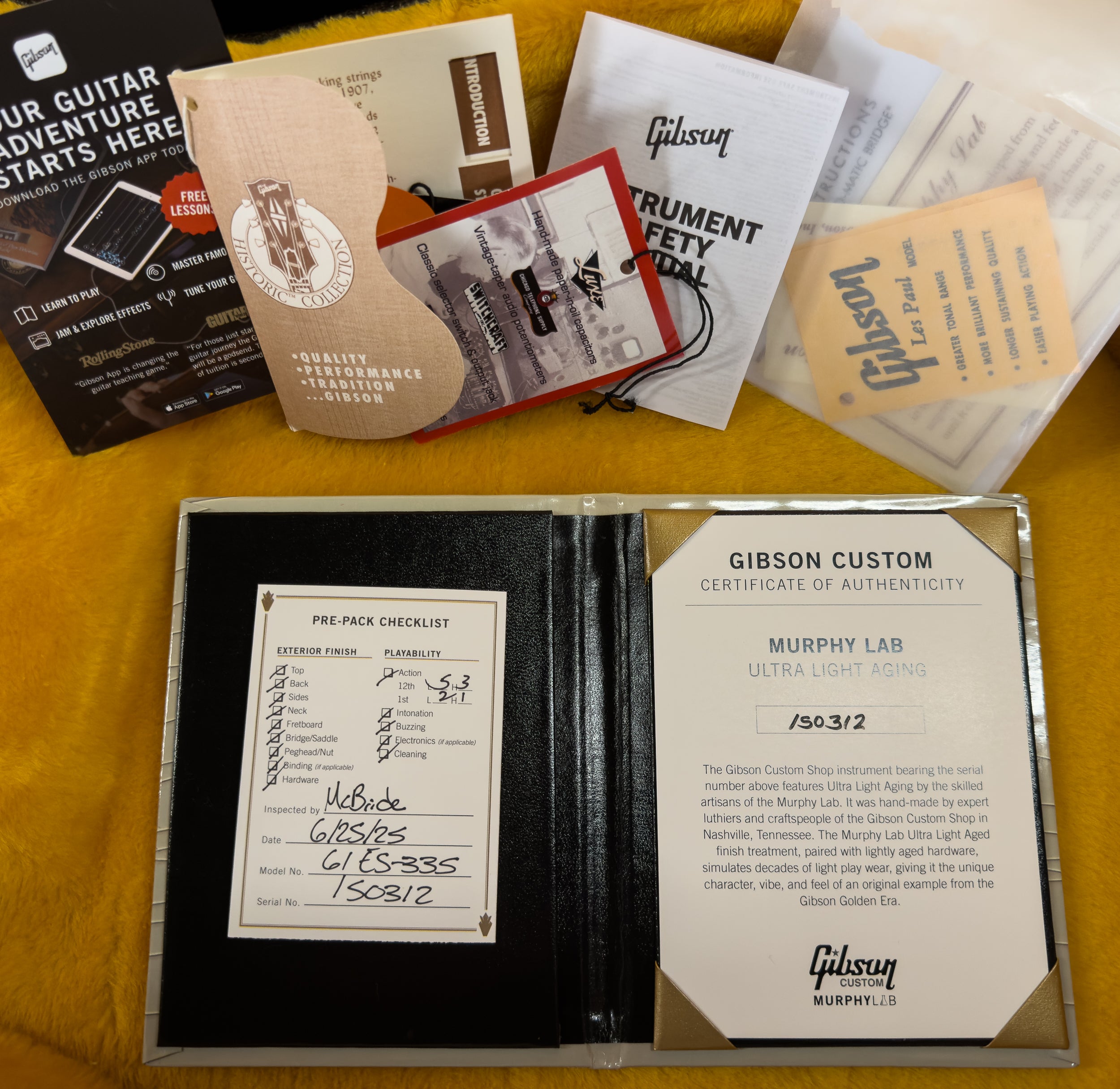 The Historic Reissue ES-335 is back and better than ever thanks to a year of studying, scanning, and listening to original examples. The expert craftspeople at the Gibson Custom Shop have rendered every contour, profile, inlay and color of the priceless vintage ES models in magnificent detail. The result is a playing and ownership experience that will keep you coming back for more. The 1961 Reissue models utilize rounded cutaways, SlimTaper neck proles scanned from originals, dot inlays and vintage-replica parts. It also features Ultra Light Aging by the skilled artisans of the Murphy Lab. The Murphy Lab Ultra Light Aged finish treatment, paired with lightly aged hardware, simulates decades of light play wear, giving it the unique character, vibe, and feel of an original example from the Gibson Golden Era.