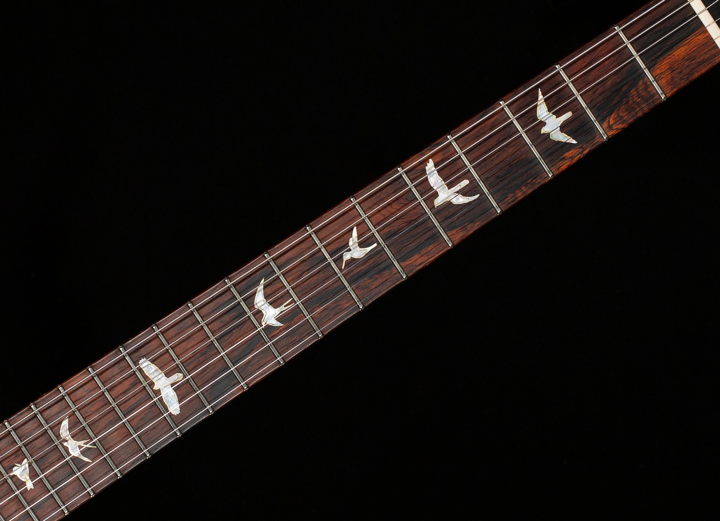 The Pattern neck shape crafted from Rosewood ensures a smooth, comfortable playing feel, while the fretboard is made from Cocobolo, featuring Mother of Pearl J-Bird inlays with Gold Mother of Pearl outlines—a signature PRS touch that adds elegance and sophistication.