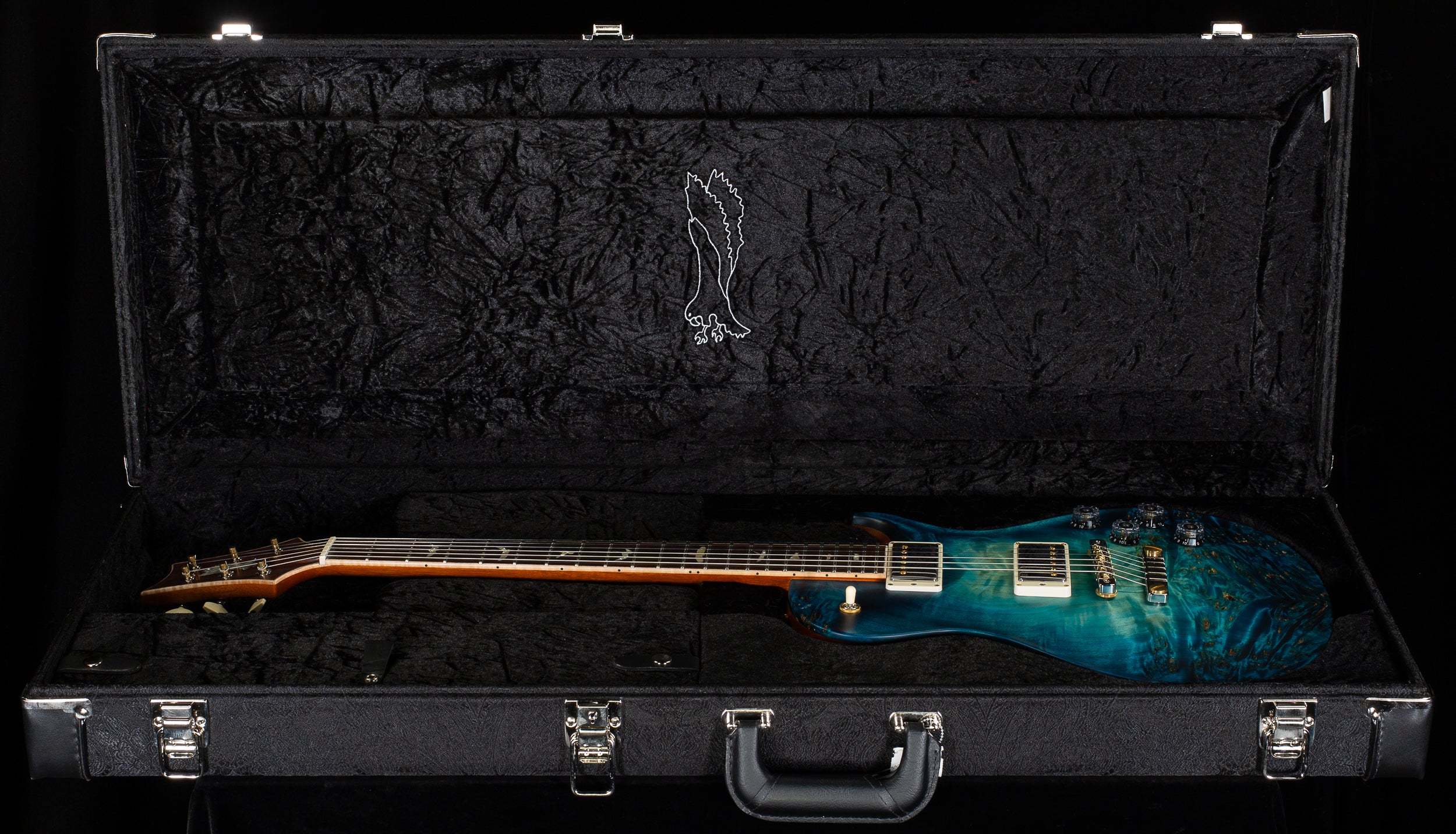 This one-of-a-kind PRS Private Stock McCarty SC56 (#12068) is a breathtaking blend of tonal depth and aesthetic mastery. Finished in the icy brilliance of Sub-Zero Glow, its hand-selected Poplar Burl top reveals dramatic figuring beneath a luminous satin nitrocellulose finish. The body and neck are carved from rich African Mahogany, offering warmth, sustain, and classic resonance.