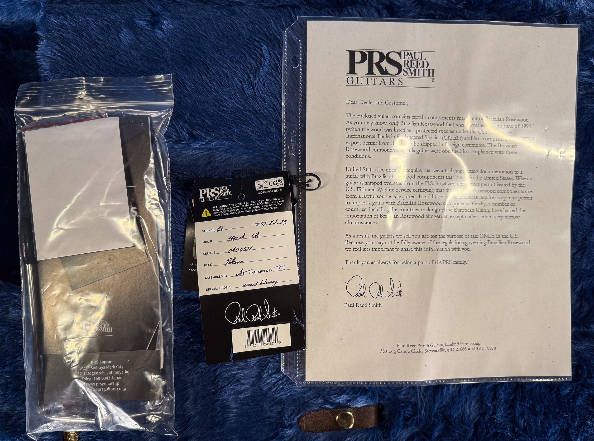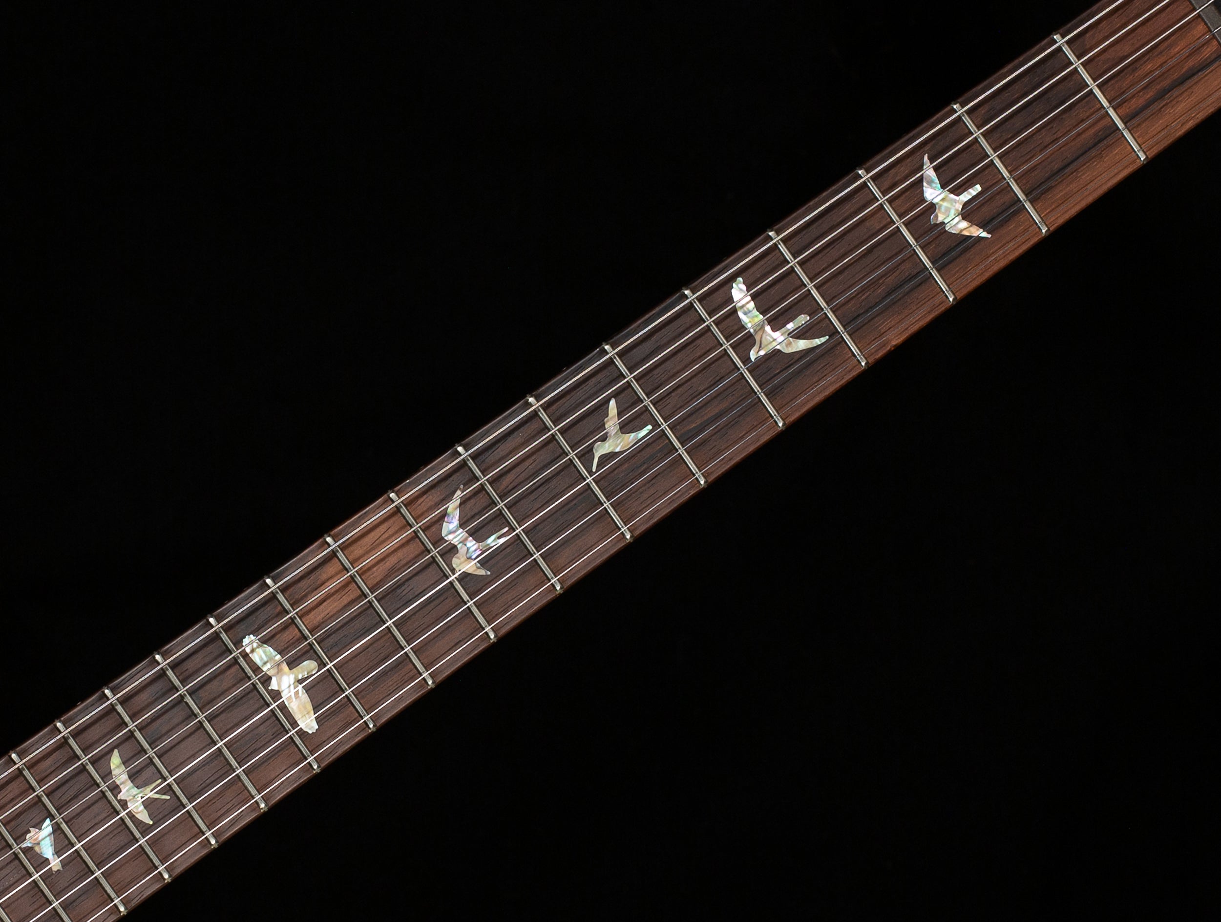 The Brazilian Rosewood fretboard is adorned with "old school" Birds inlays in Green Ripple Abalone, adding an extra layer of elegance. With a 25” scale length, 22 frets, and a bone nut (1-11/16” width), PRS gen III patented tremolo and this guitar is designed for smooth playability and excellent intonation.