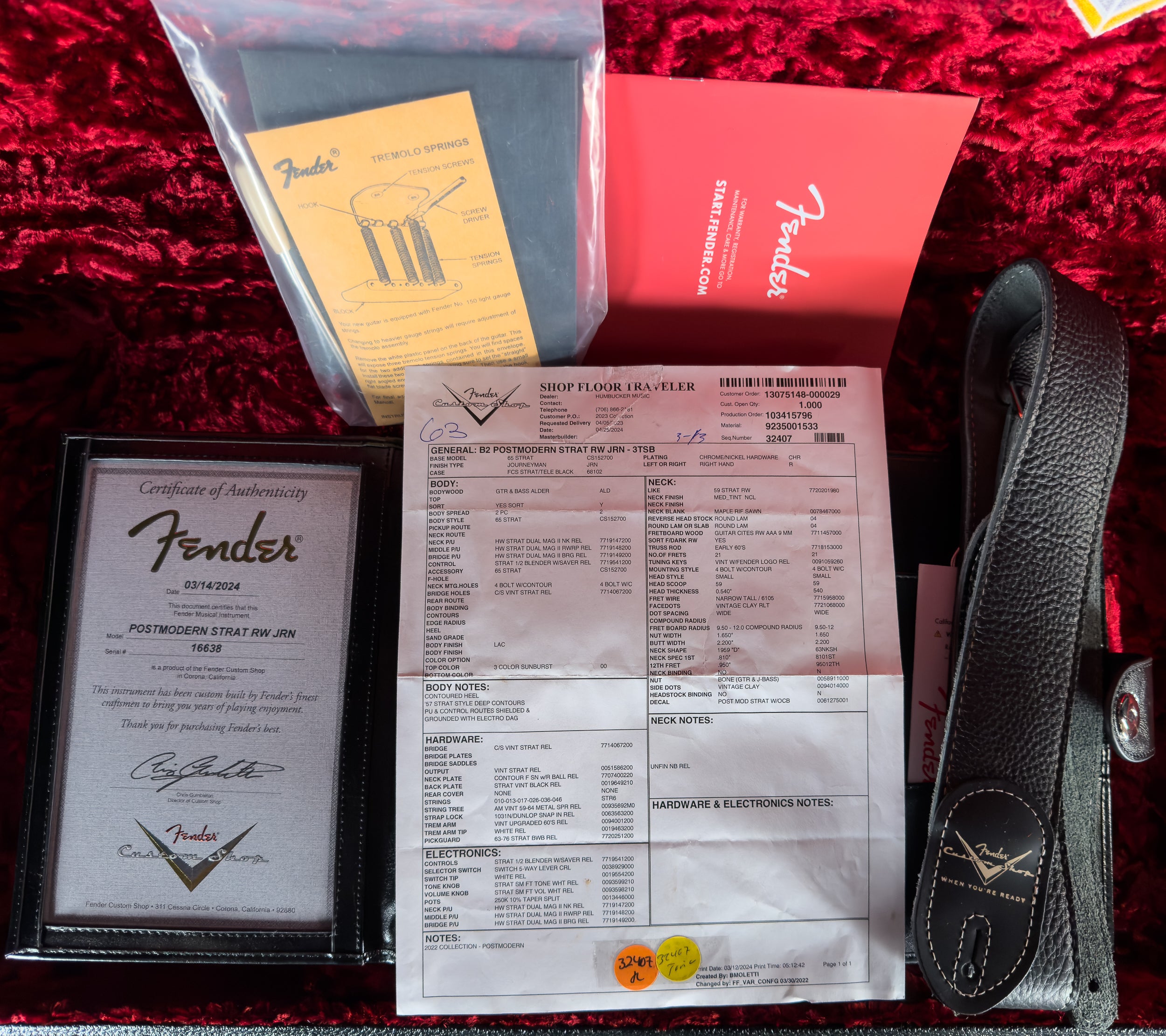 This Fender Custom Shop Postmodern Stratocaster blends classic Strat heritage with modern refinements. Its lightweight alder body with a 3-Color Sunburst nitro finish is paired with a quartersawn maple neck and a round-lam rosewood fingerboard for exceptional feel and resonance. Outfitted with hand-wound Strat Dual Mag II pickups, a compound 9.5"–12" radius, and a vintage-style synchronized tremolo, it offers timeless Strat tone with enhanced playability. Crafted with meticulous detail in the Custom Shop, this instrument is built for discerning players who demand vintage vibe and modern performance.