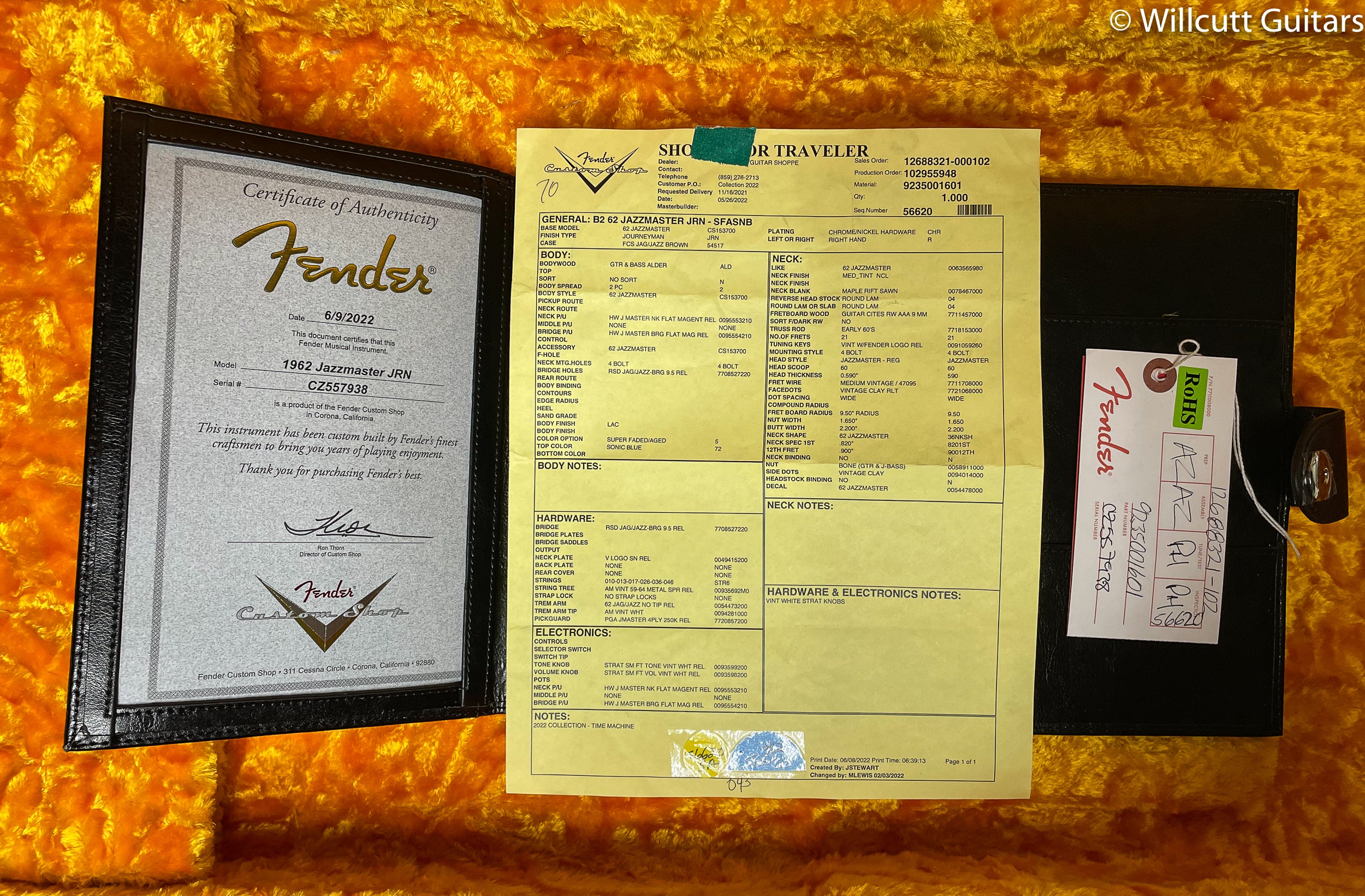 The Custom Shop hand-wound Jazzmaster pickups are wound to vintage spec and produce a distinct mellow tone. Vintage wiring includes a three-way toggle switch and two separate volume/tone controls with a lead/rhythm switch. Other features include a four-ply brown shell pickguard, RSD J-Bridge with compensated brass saddles, vintage-style tuning machines and a bone nut. Also includes deluxe hardshell case, strap and certificate of authenticity.